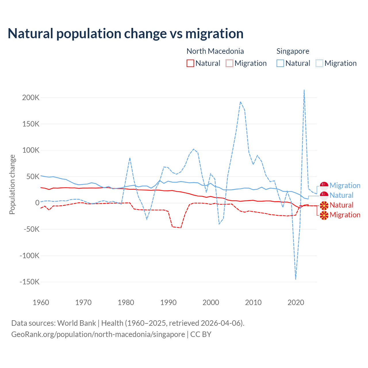 Over the last 10 years, 6.45% of the population change in North Macedonia is from natural causes (a loss of 12,585 people) and 93.5% is from migration (a loss of 182,429 people). In Singapore 54.8% is from natural causes (a gain of 195,953 people) and 45.2% is from migration (a gain of 161,805 people).