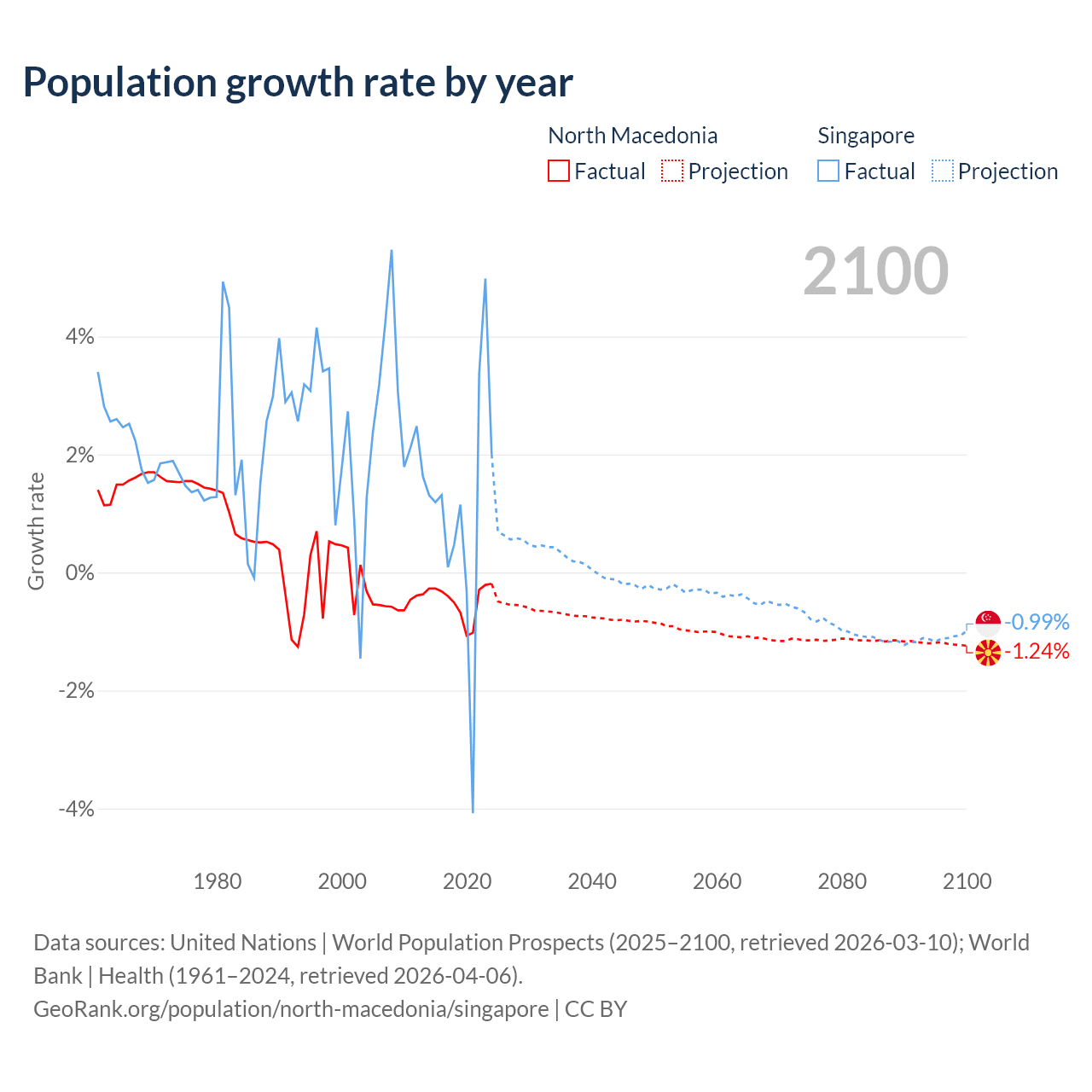 - For the last 10 years, North Macedonia has had an average growth rate of -0.48% per year vs +1.04% in Singapore.
