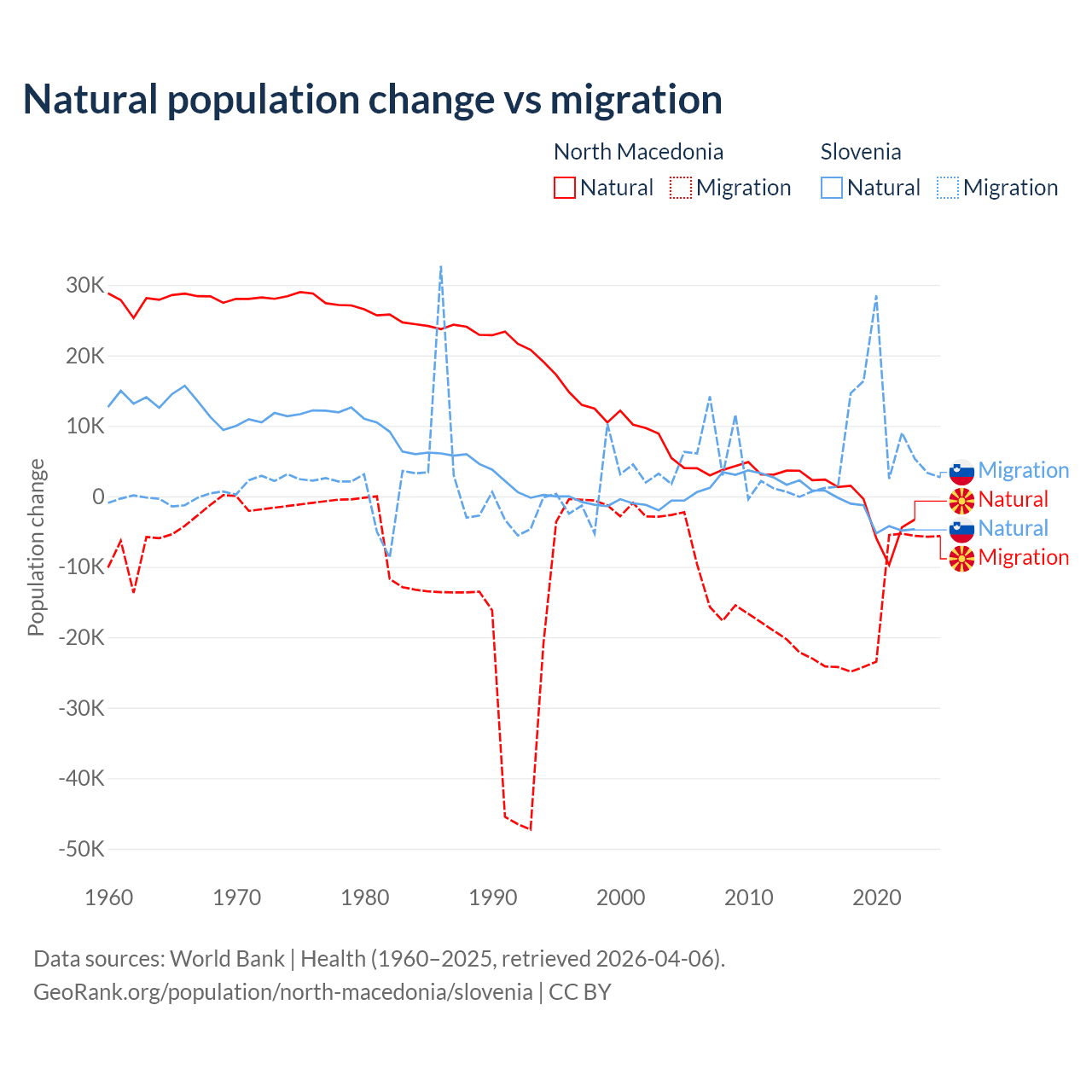 Over the last 10 years, 6.45% of the population change in North Macedonia is from natural causes (a loss of 12,585 people) and 93.5% is from migration (a loss of 182,429 people). In Slovenia 18.1% is from natural causes (a loss of 17,573 people) and 81.9% is from migration (a gain of 79,532 people).