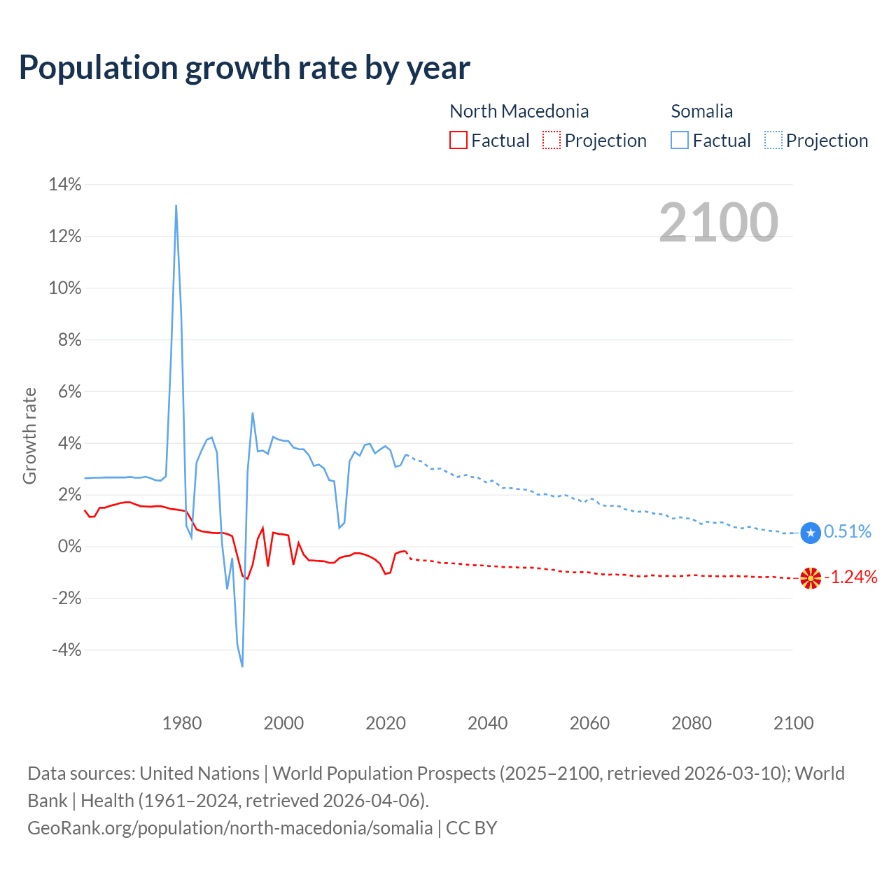 - For the last 10 years, North Macedonia has had an average growth rate of -0.48% per year vs +3.61% in Somalia.