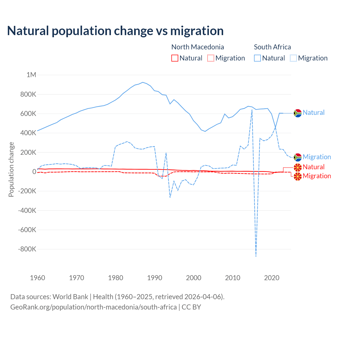 Over the last 10 years, 6.45% of the population change in North Macedonia is from natural causes (a loss of 12,585 people) and 93.5% is from migration (a loss of 182,429 people). In South Africa 72.8% is from natural causes (a gain of 6,190,027 people) and 27.2% is from migration (a gain of 2,316,795 people).