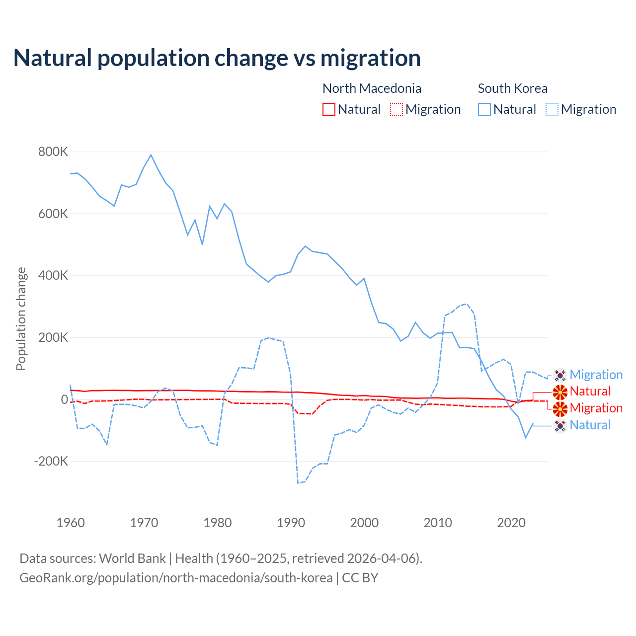 Over the last 10 years, 6.45% of the population change in North Macedonia is from natural causes (a loss of 12,585 people) and 93.5% is from migration (a loss of 182,429 people). In South Korea 17.6% is from natural causes (a gain of 277,215 people) and 82.4% is from migration (a gain of 1,298,356 people).