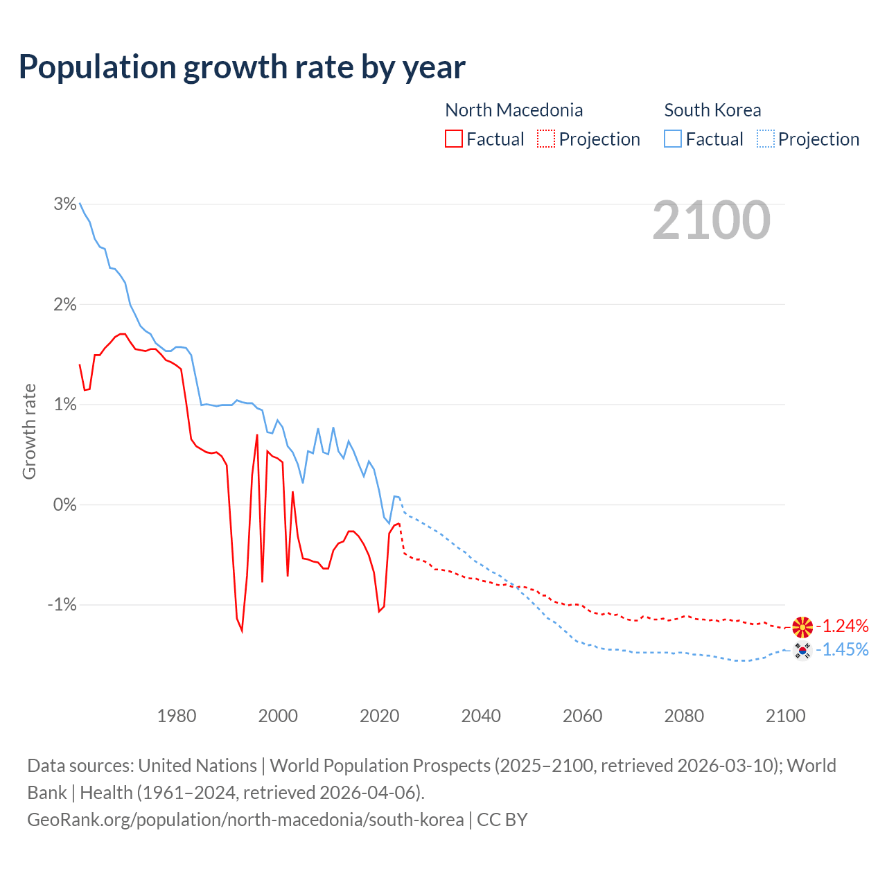 - For the last 10 years, North Macedonia has had an average growth rate of -0.48% per year vs +0.24% in South Korea.