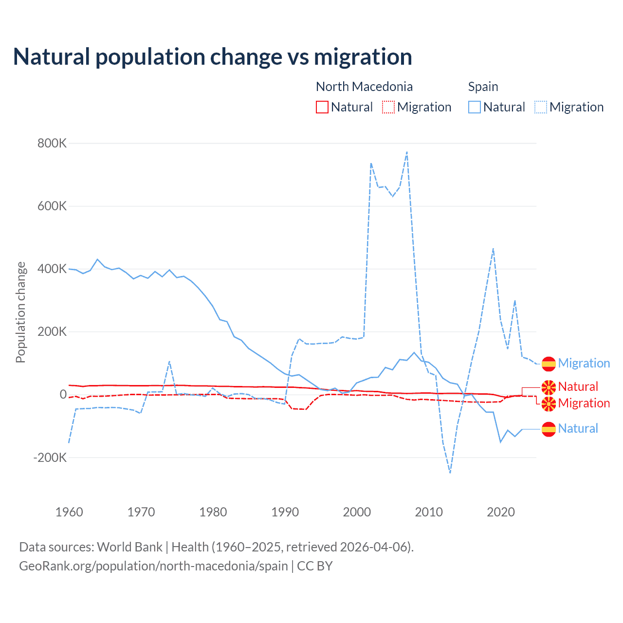 Over the last 10 years, 6.45% of the population change in North Macedonia is from natural causes (a loss of 12,585 people) and 93.5% is from migration (a loss of 182,429 people). In Spain 25.8% is from natural causes (a loss of 627,829 people) and 74.2% is from migration (a gain of 1,810,127 people).