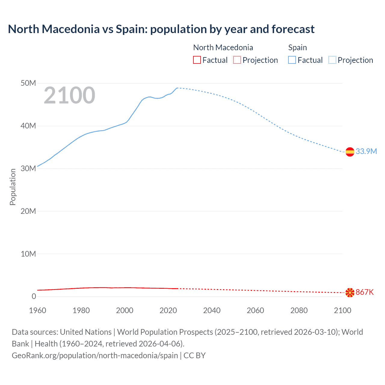 The latest officially reported population of North Macedonia was 1,824,359 in 2024 vs 48,848,840 people in Spain in 2024. In 2026, based on the adjusted UN estimation, the current North Macedonia's population is 1,805,954 people compared to 48,806,901 in Spain.