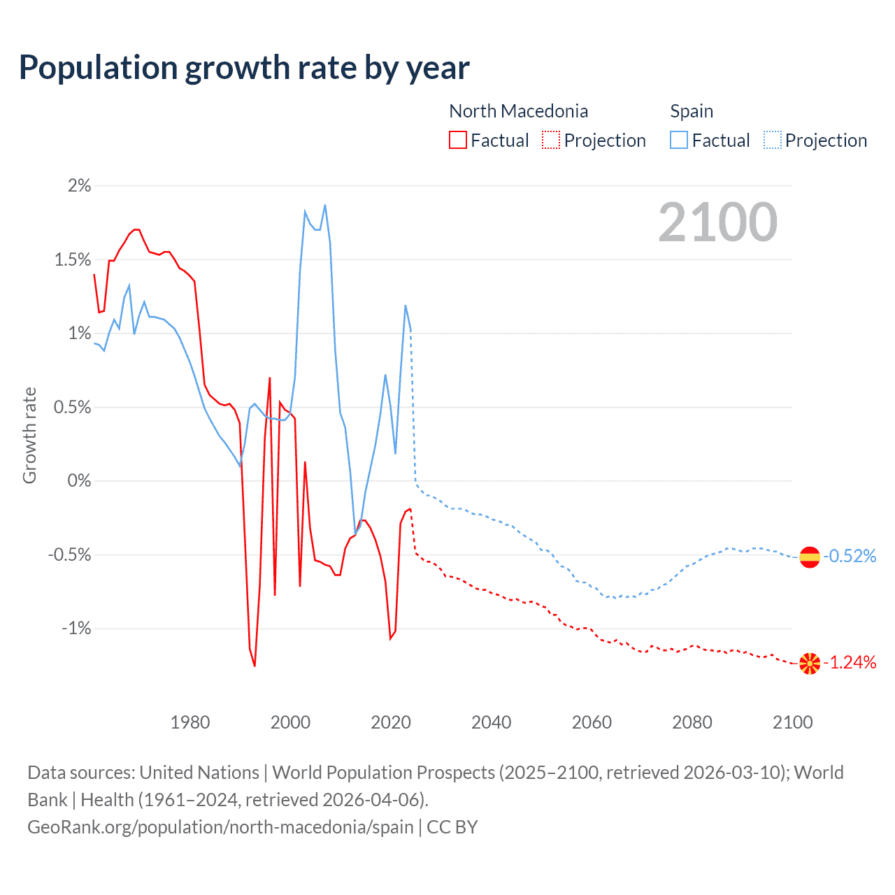- For the last 10 years, North Macedonia has had an average growth rate of -0.48% per year vs +0.43% in Spain.