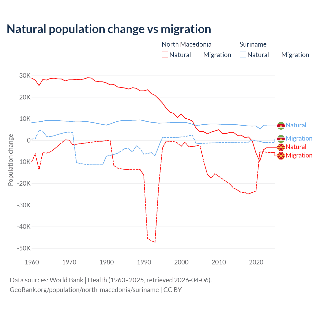 Over the last 10 years, 6.45% of the population change in North Macedonia is from natural causes (a loss of 12,585 people) and 93.5% is from migration (a loss of 182,429 people). In Suriname 90.3% is from natural causes (a gain of 66,709 people) and 9.72% is from migration (a loss of 7,185 people).