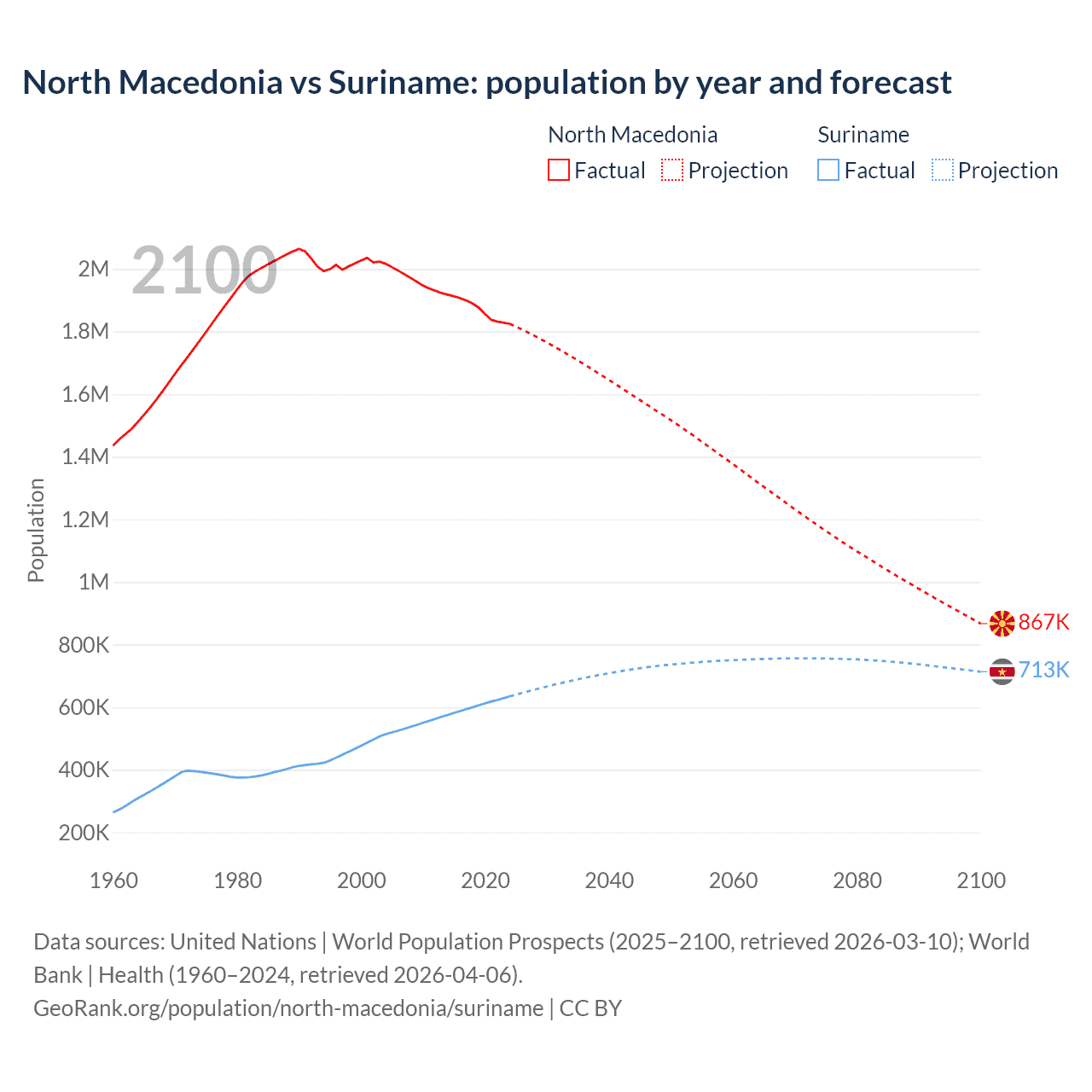 The latest officially reported population of North Macedonia was 1,824,359 in 2024 vs 634,431 people in Suriname in 2024. In 2026, based on the adjusted UN estimation, the current North Macedonia's population is 1,805,954 people compared to 646,767 in Suriname.