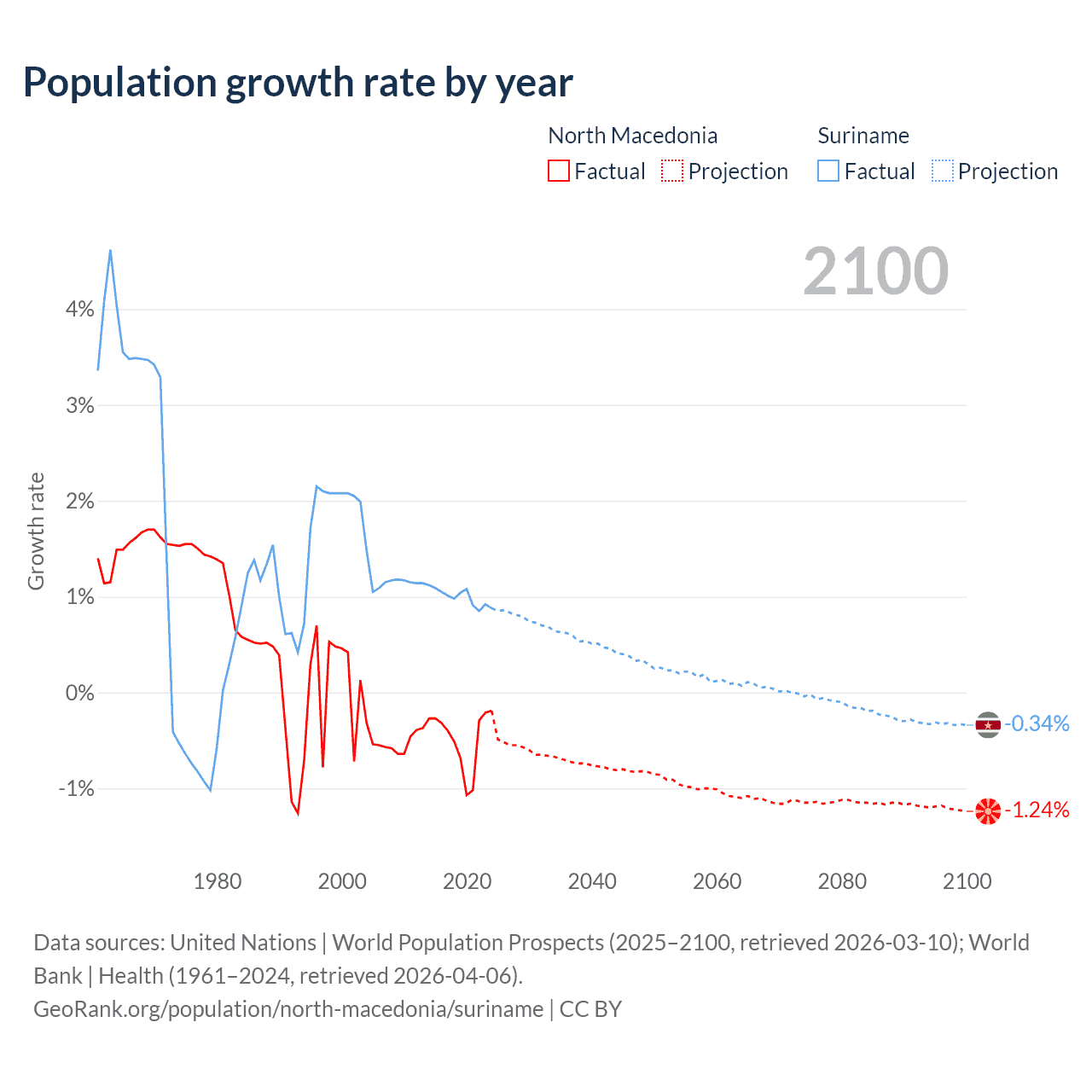 - For the last 10 years, North Macedonia has had an average growth rate of -0.48% per year vs +0.99% in Suriname.