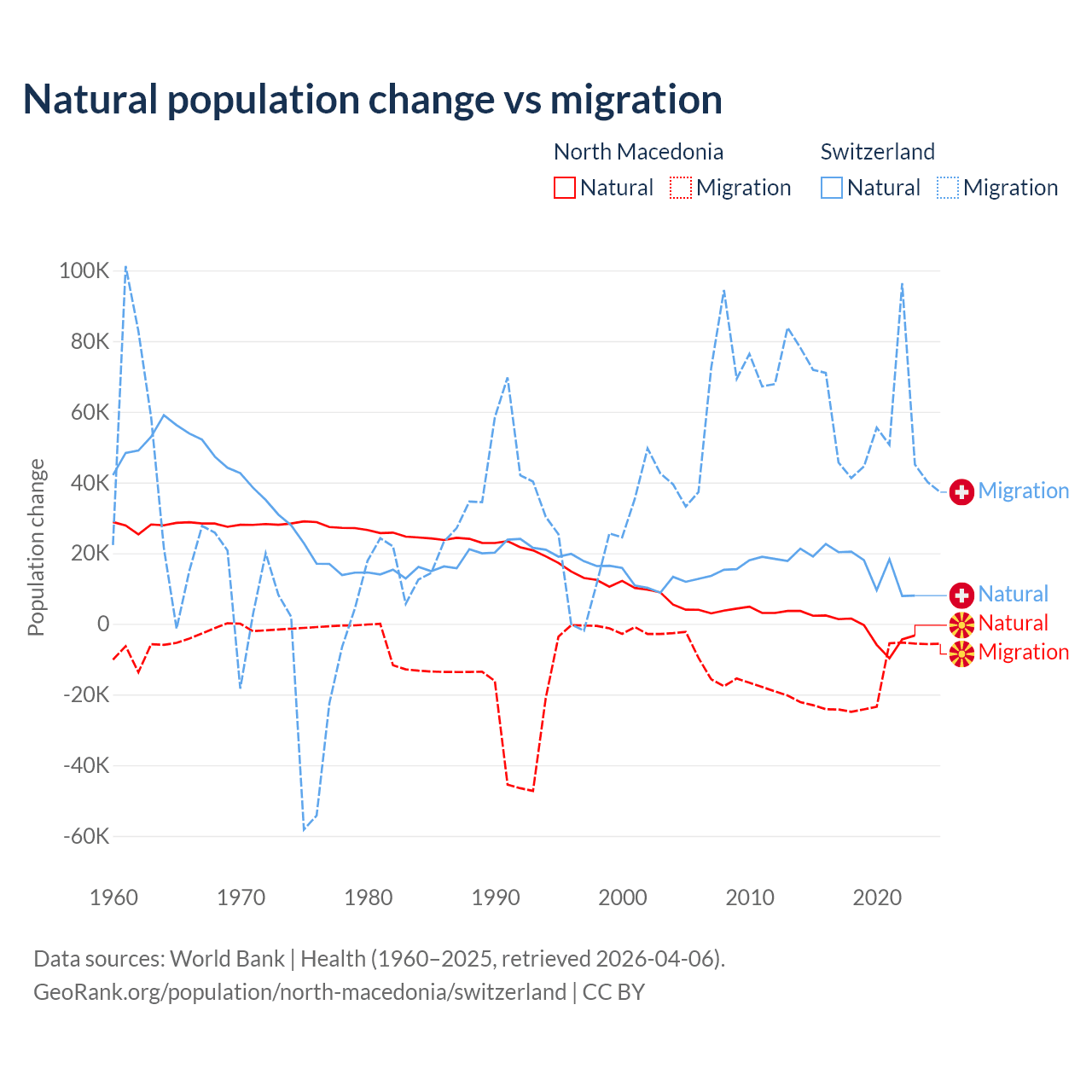 Over the last 10 years, 6.45% of the population change in North Macedonia is from natural causes (a loss of 12,585 people) and 93.5% is from migration (a loss of 182,429 people). In Switzerland 21.6% is from natural causes (a gain of 165,354 people) and 78.4% is from migration (a gain of 600,145 people).