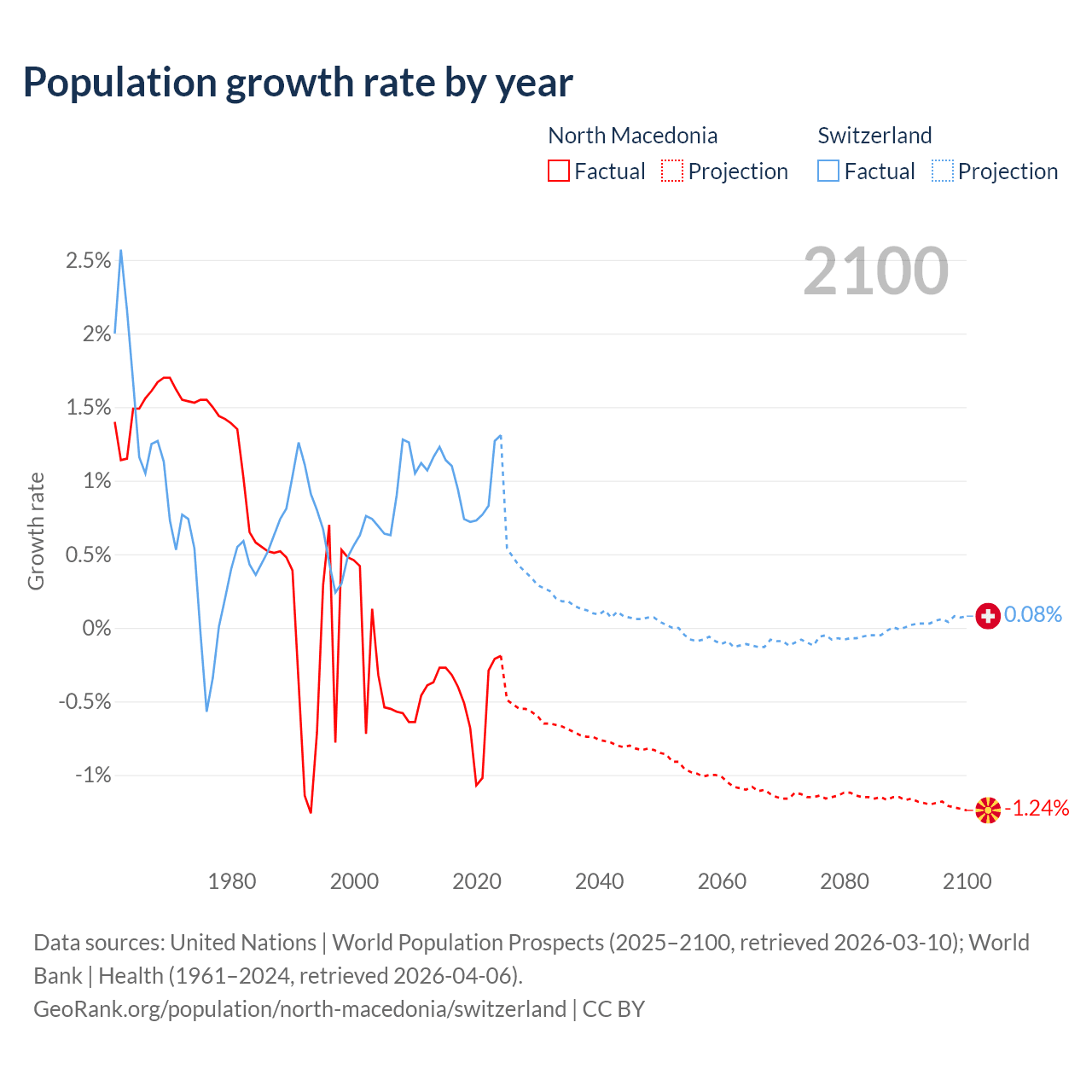 - For the last 10 years, North Macedonia has had an average growth rate of -0.48% per year vs +0.98% in Switzerland.