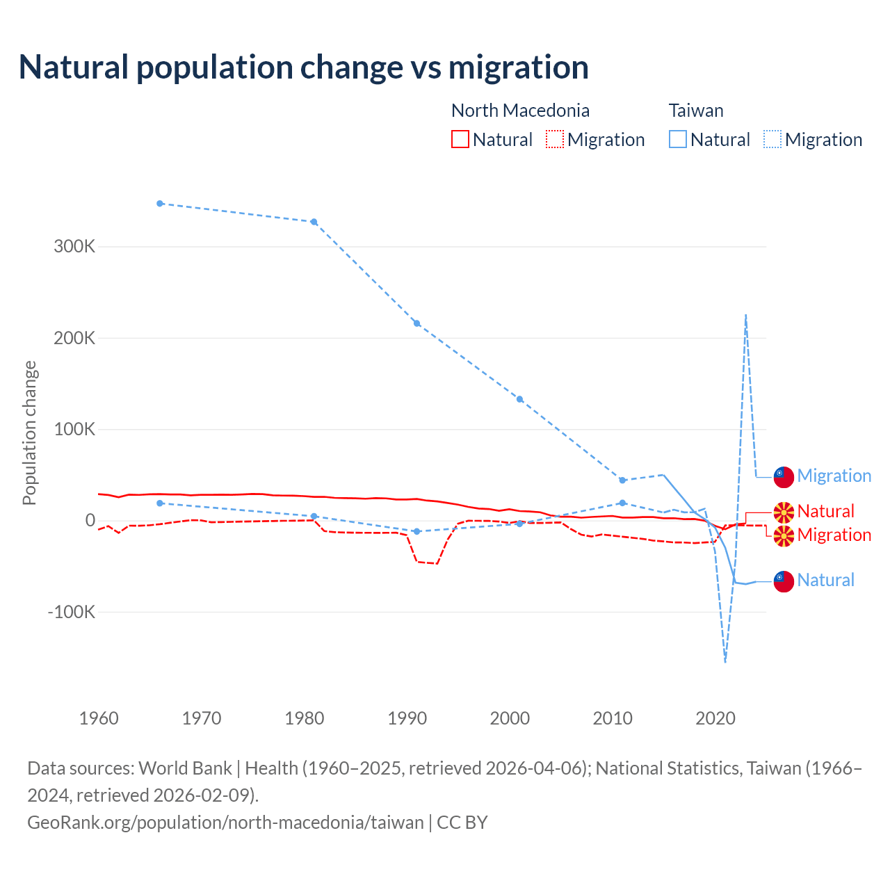 Over the last 10 years, 6.45% of the population change in North Macedonia is from natural causes (a loss of 12,585 people) and 93.5% is from migration (a loss of 182,429 people). In Taiwan 56.7% is from natural causes (a loss of 57,467 people) and 43.3% is from migration (a gain of 43,884 people).