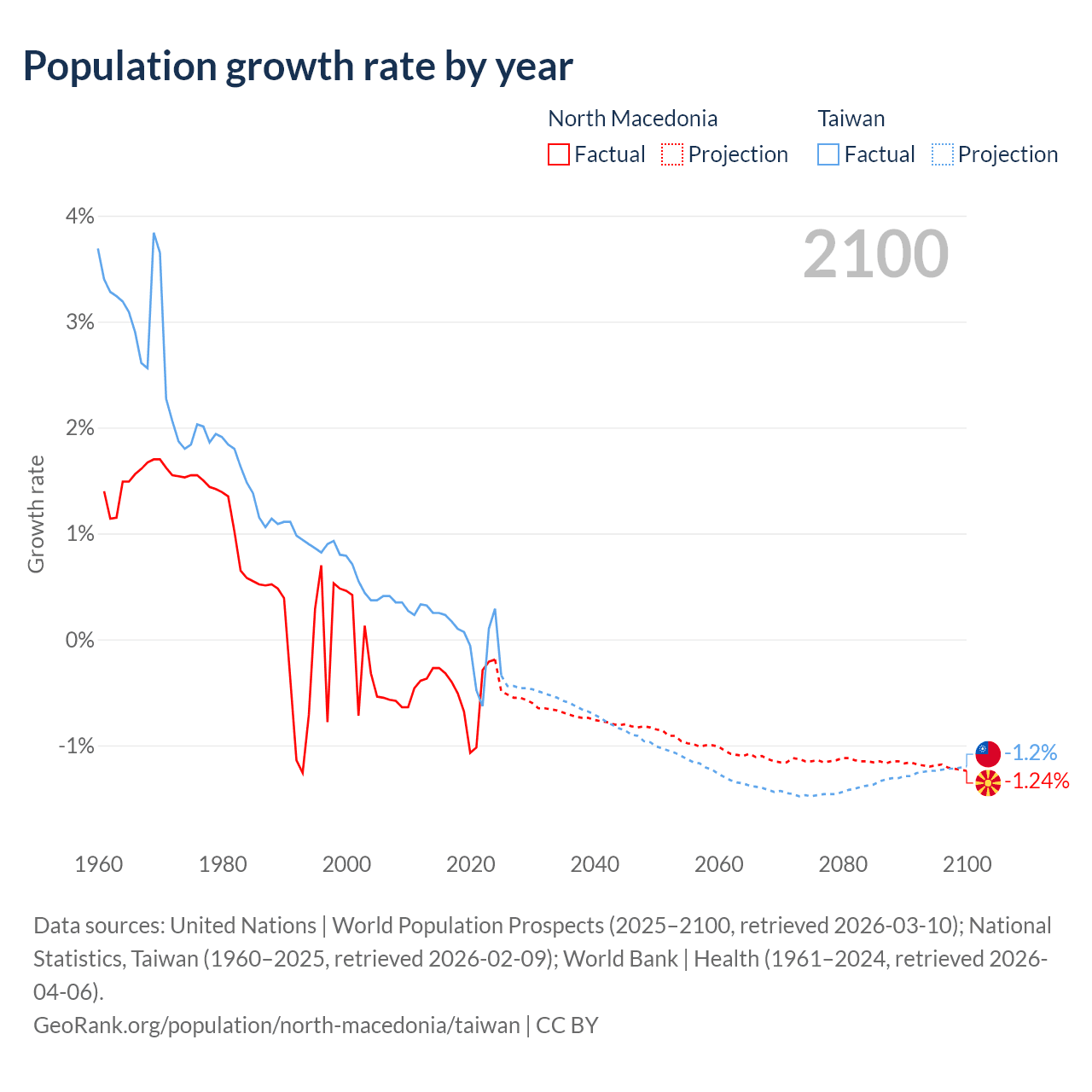 - For the last 10 years, North Macedonia has had an average growth rate of -0.48% per year vs -0.03% in Taiwan.