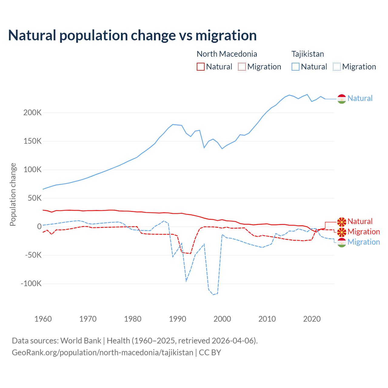 Over the last 10 years, 6.45% of the population change in North Macedonia is from natural causes (a loss of 12,585 people) and 93.5% is from migration (a loss of 182,429 people). In Tajikistan 96% is from natural causes (a gain of 2,266,045 people) and 3.95% is from migration (a loss of 93,205 people).