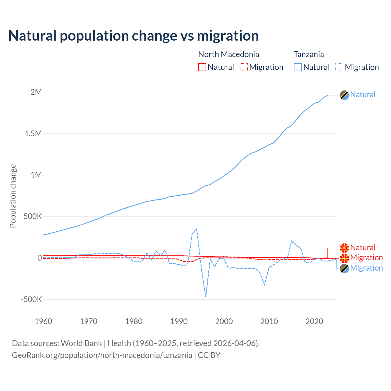 Over the last 10 years, 6.45% of the population change in North Macedonia is from natural causes (a loss of 12,585 people) and 93.5% is from migration (a loss of 182,429 people). In Tanzania 98.7% is from natural causes (a gain of 17,769,541 people) and 1.27% is from migration (a gain of 229,466 people).
