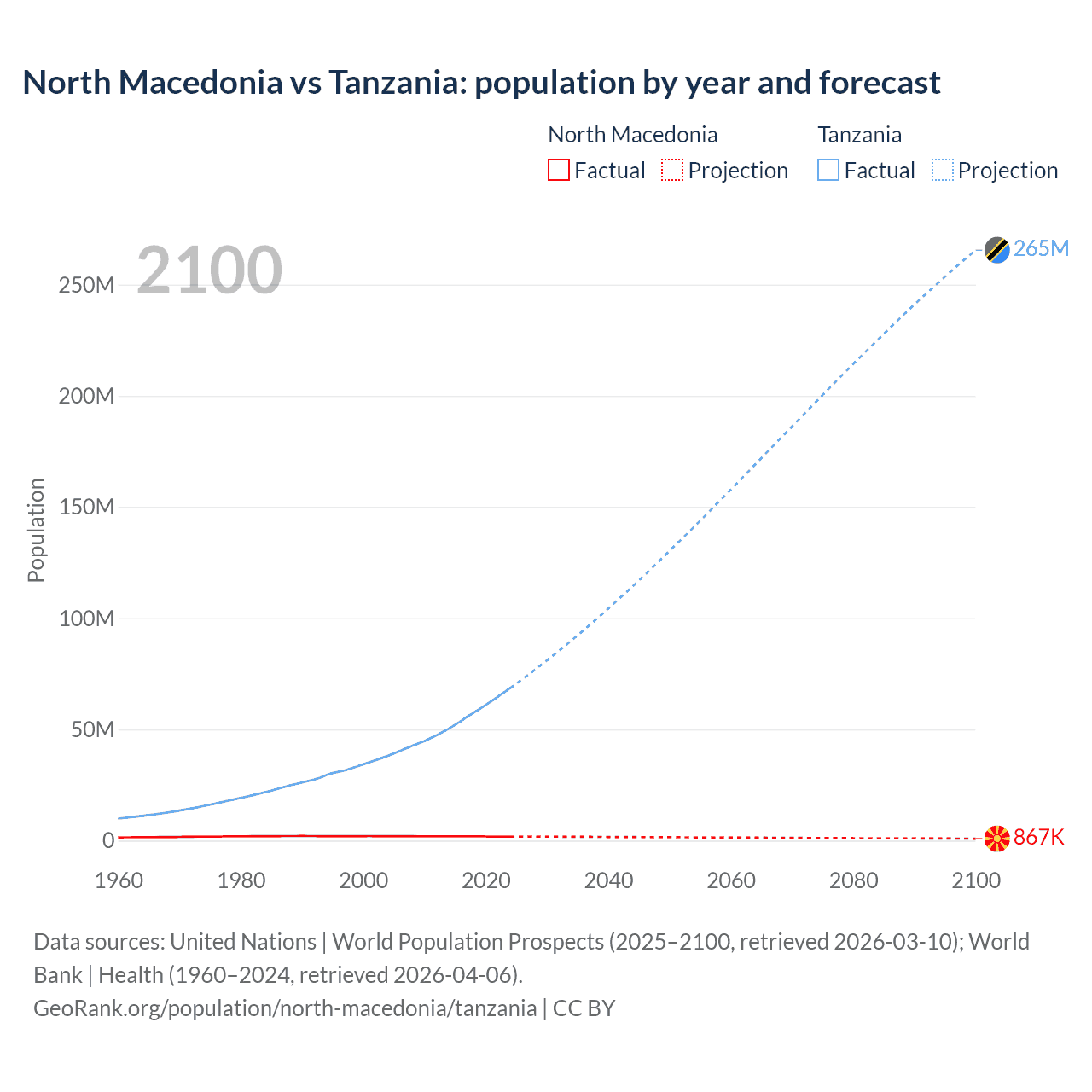 - Since 2006, the population of North Macedonia has decreased from 1.99M people to 1.81M (9.44% decline), while Tanzania has grown from 40.3M to 73.1M (81.5% growth).