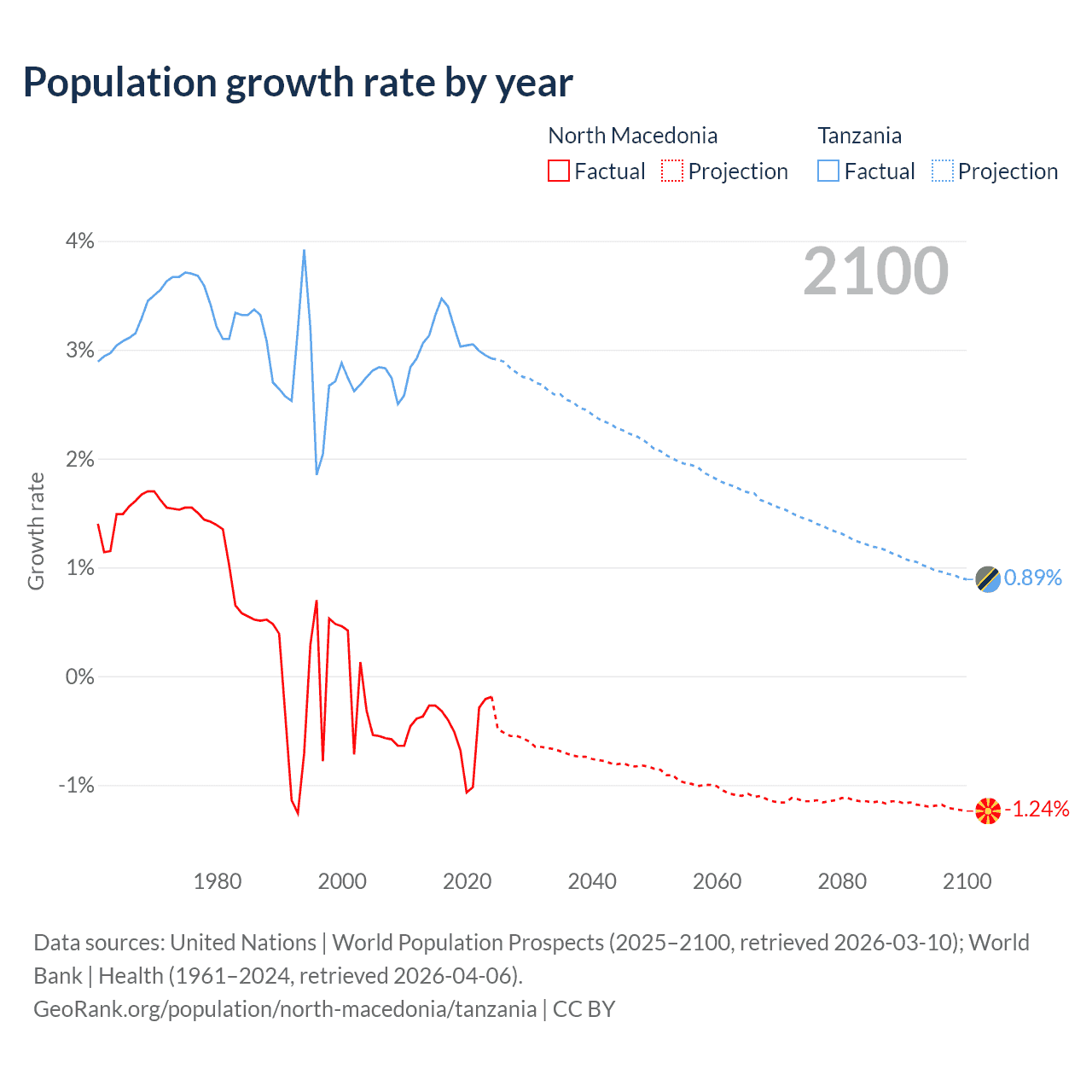 - For the last 10 years, North Macedonia has had an average growth rate of -0.48% per year vs +3.13% in Tanzania.