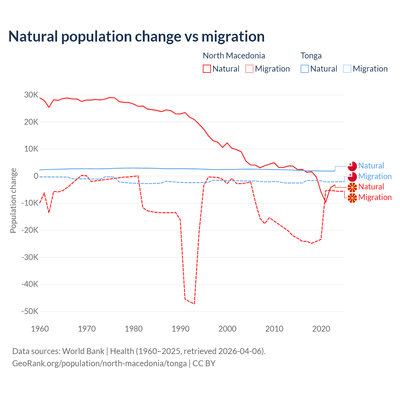 Over the last 10 years, 6.45% of the population change in North Macedonia is from natural causes (a loss of 12,585 people) and 93.5% is from migration (a loss of 182,429 people). In Tonga 46.9% is from natural causes (a gain of 18,919 people) and 53.1% is from migration (a loss of 21,384 people).