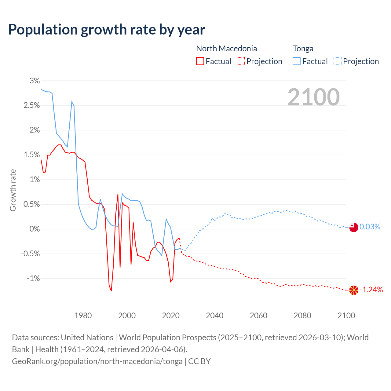 North Macedonia vs Tonga: population by year and forecast