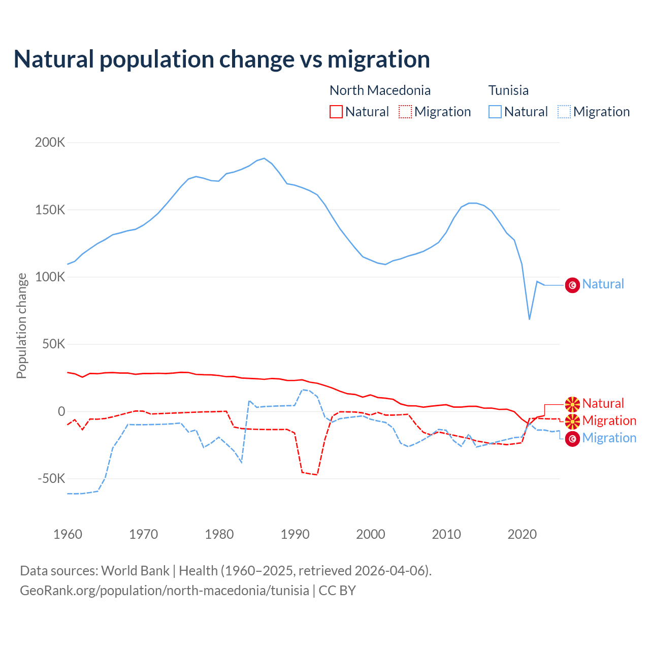 Over the last 10 years, 6.45% of the population change in North Macedonia is from natural causes (a loss of 12,585 people) and 93.5% is from migration (a loss of 182,429 people). In Tunisia 86.3% is from natural causes (a gain of 1,225,079 people) and 13.7% is from migration (a loss of 195,011 people).