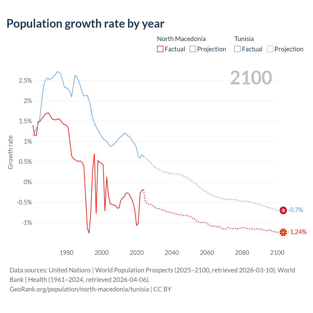 - For the last 10 years, North Macedonia has had an average growth rate of -0.48% per year vs +0.89% in Tunisia.