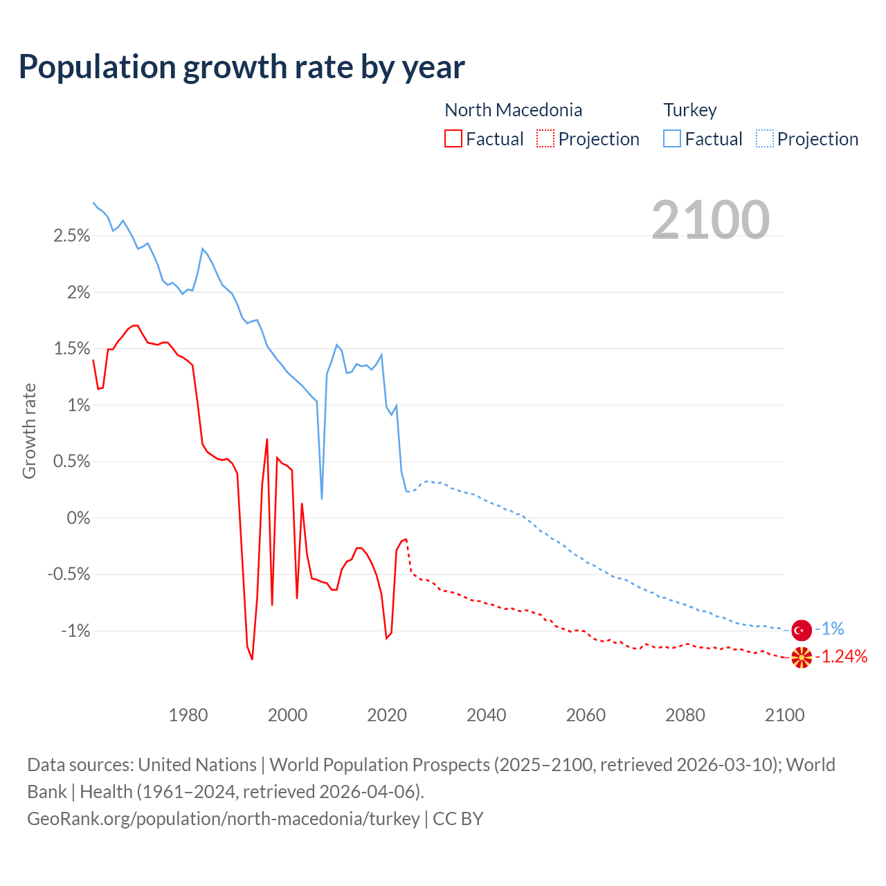 - For the last 10 years, North Macedonia has had an average growth rate of -0.48% per year vs +1.06% in Turkey.