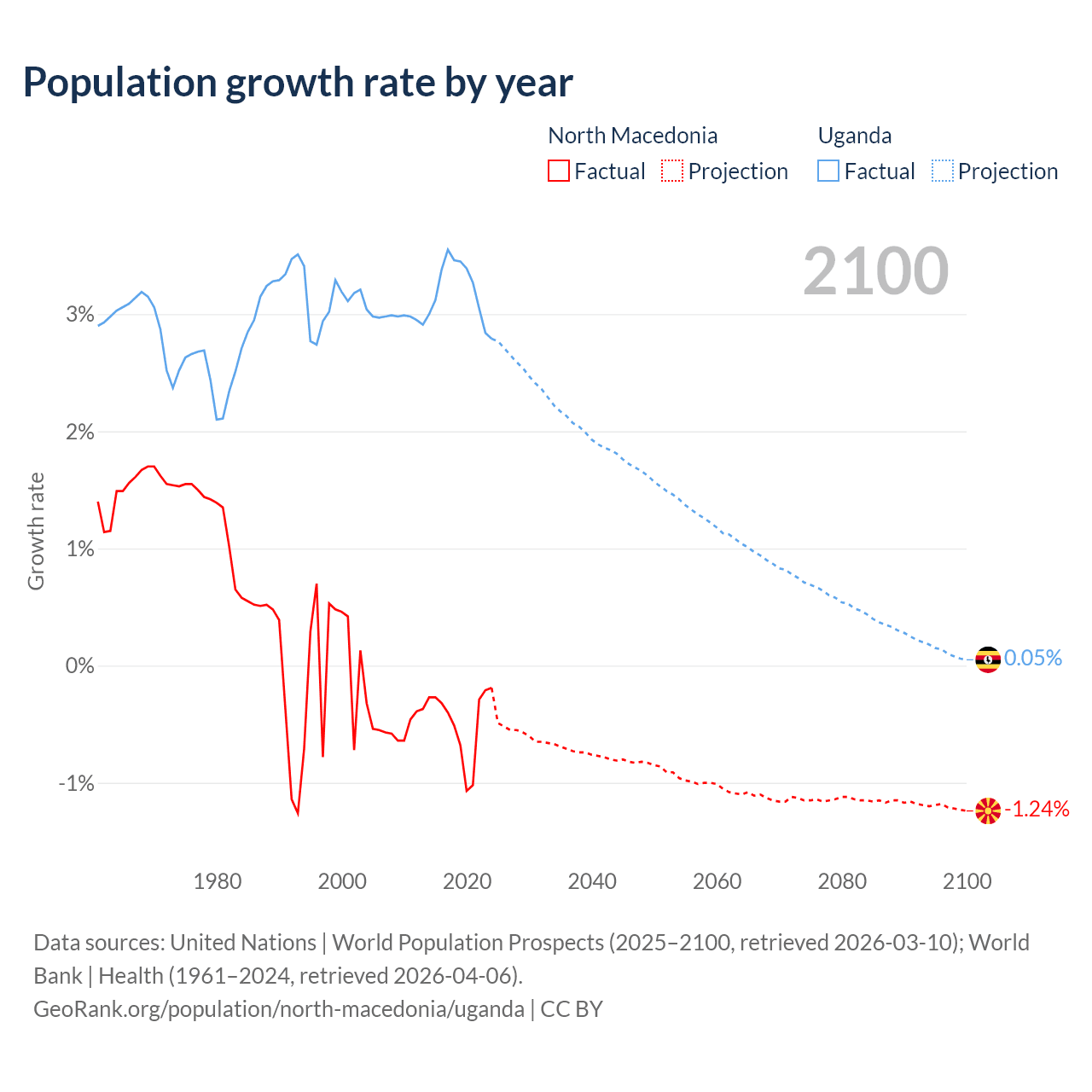 - For the last 10 years, North Macedonia has had an average growth rate of -0.48% per year vs +3.21% in Uganda.