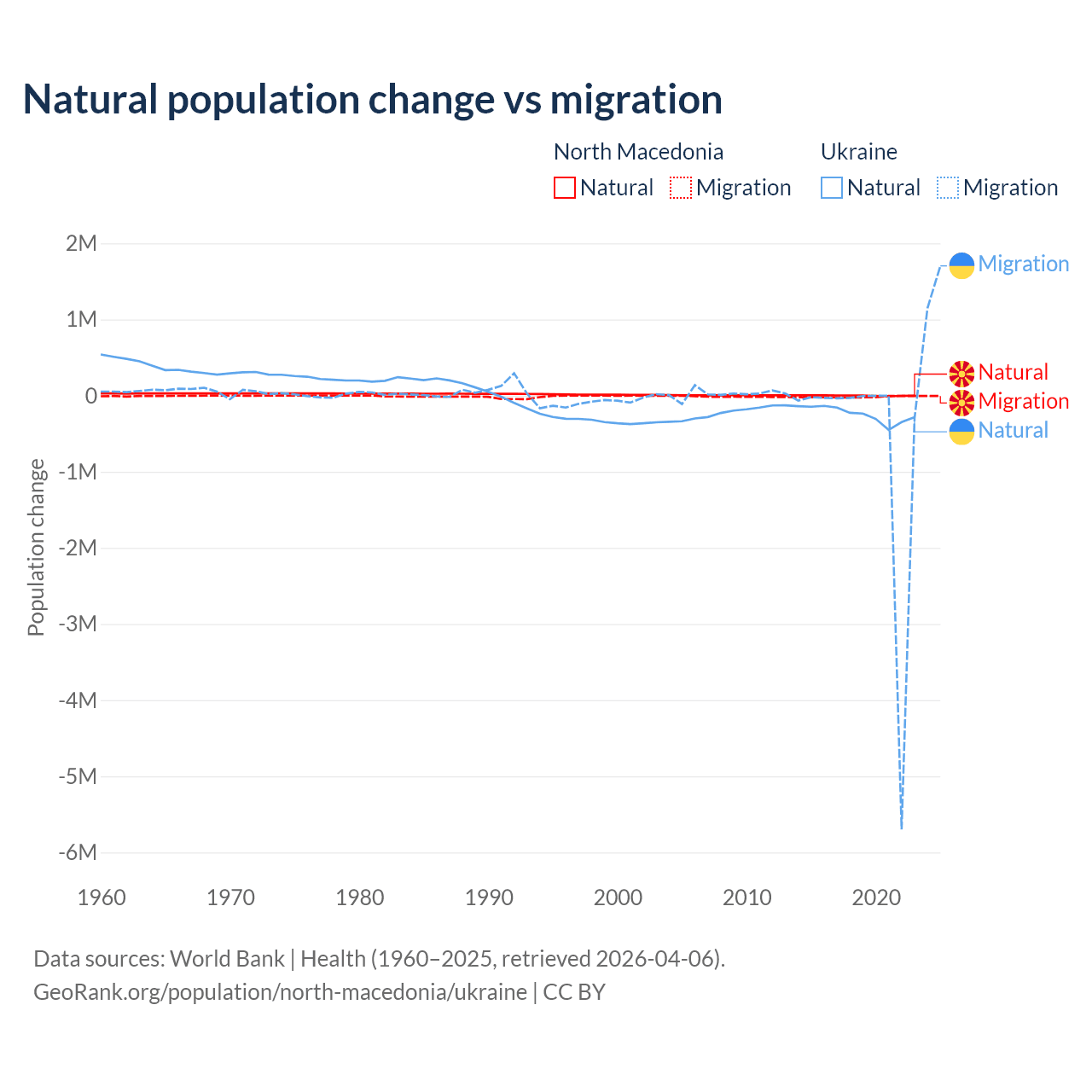 Over the last 10 years, 6.45% of the population change in North Macedonia is from natural causes (a loss of 12,585 people) and 93.5% is from migration (a loss of 182,429 people). In Ukraine 28.2% is from natural causes (a loss of 2,435,153 people) and 71.8% is from migration (a loss of 6,198,995 people).
