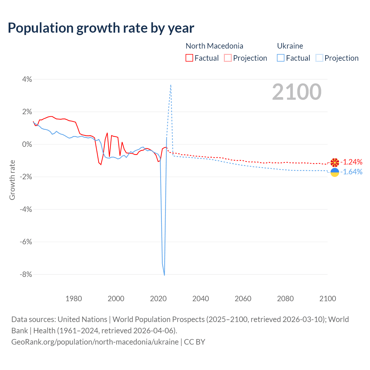 - For the last 10 years, North Macedonia has had an average growth rate of -0.48% per year vs -1.74% in Ukraine.