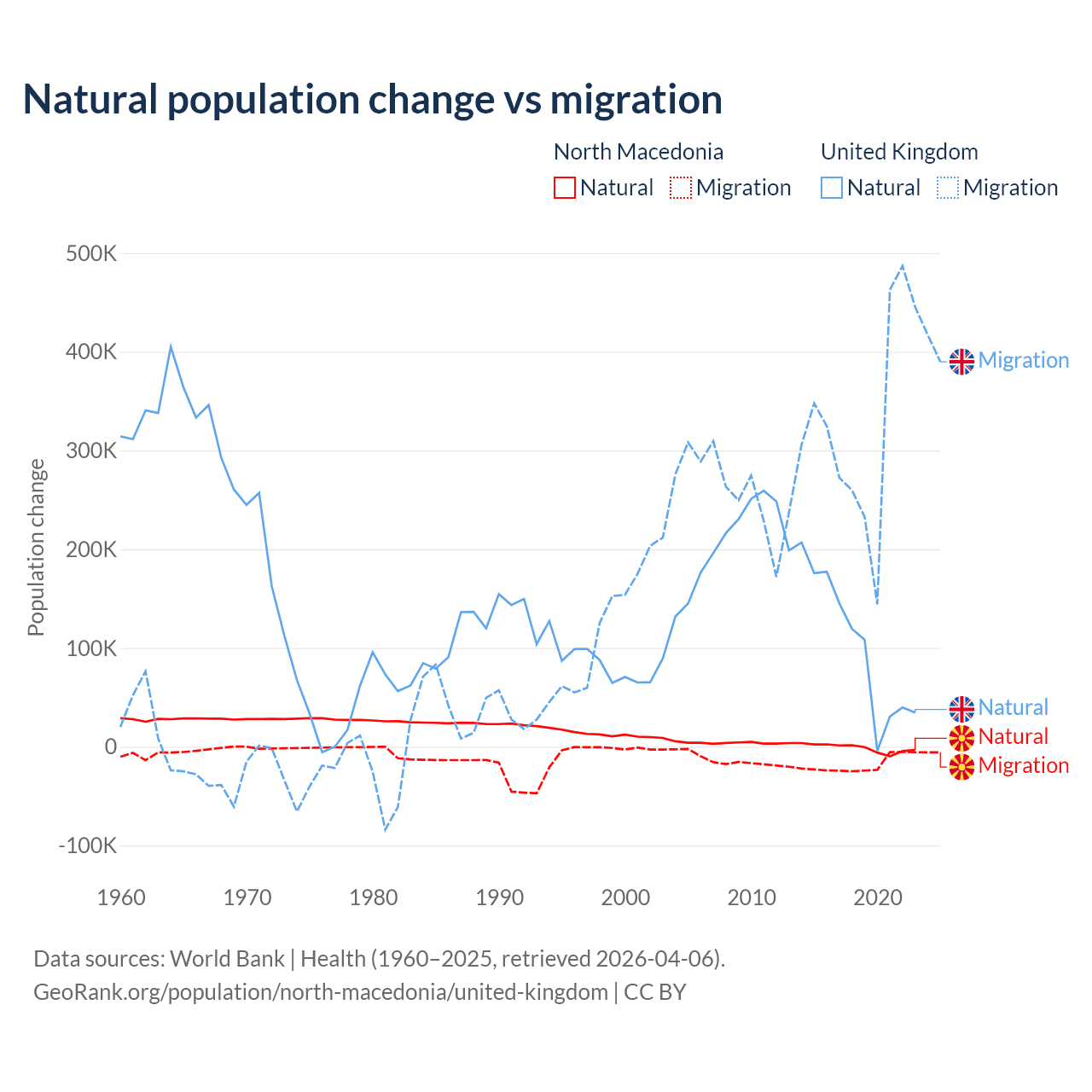 Over the last 10 years, 6.45% of the population change in North Macedonia is from natural causes (a loss of 12,585 people) and 93.5% is from migration (a loss of 182,429 people). In the United Kingdom 23.9% is from natural causes (a gain of 1,033,129 people) and 76.1% is from migration (a gain of 3,283,101 people).