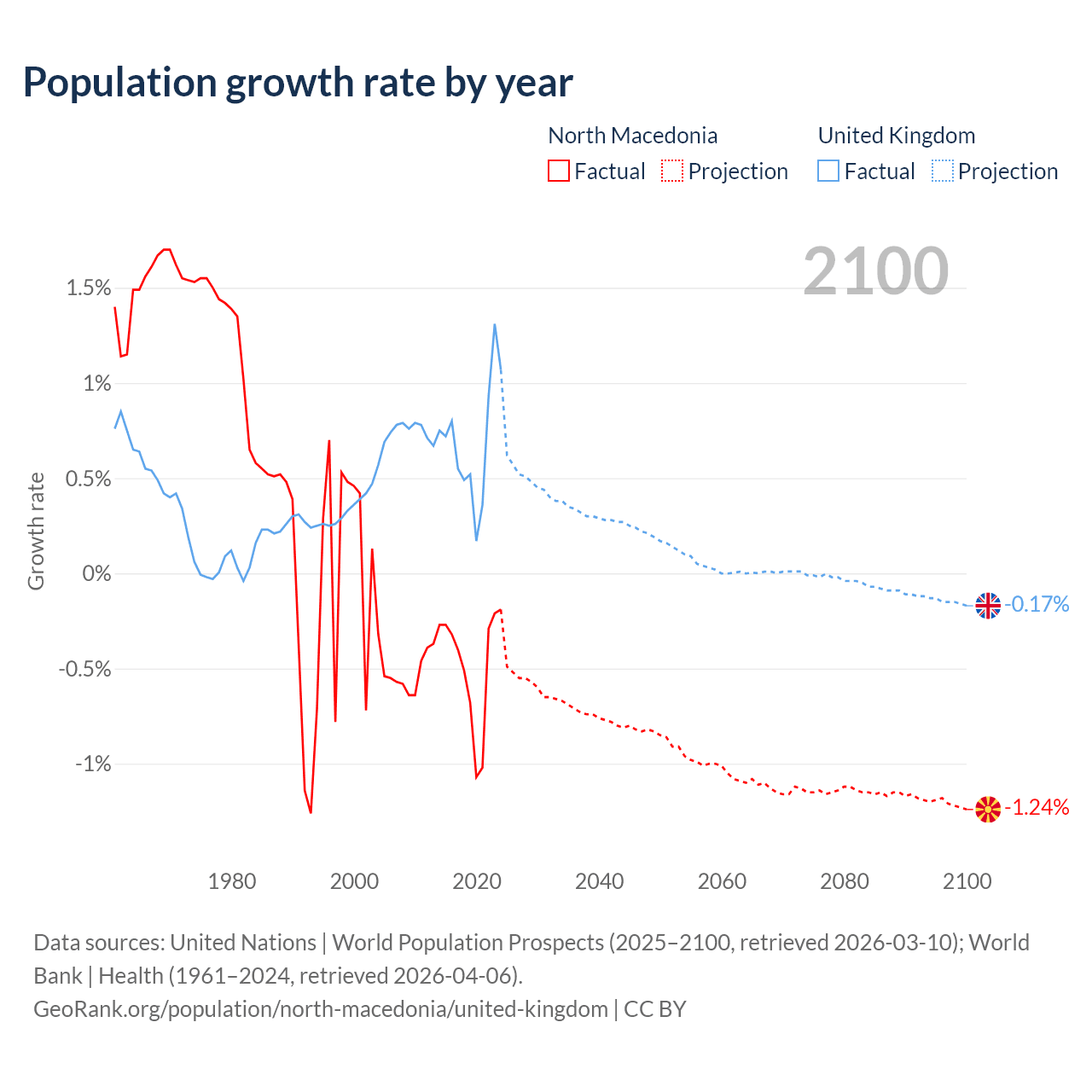 - For the last 10 years, North Macedonia has had an average growth rate of -0.48% per year vs +0.7% in the United Kingdom.