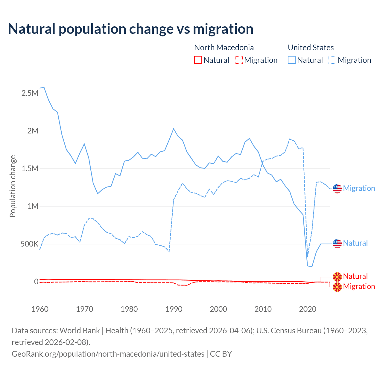 Over the last 10 years, 6.45% of the population change in North Macedonia is from natural causes (a loss of 12,585 people) and 93.5% is from migration (a loss of 182,429 people). In the United States 35.8% is from natural causes (a gain of 8,005,866 people) and 64.2% is from migration (a gain of 14,334,286 people).