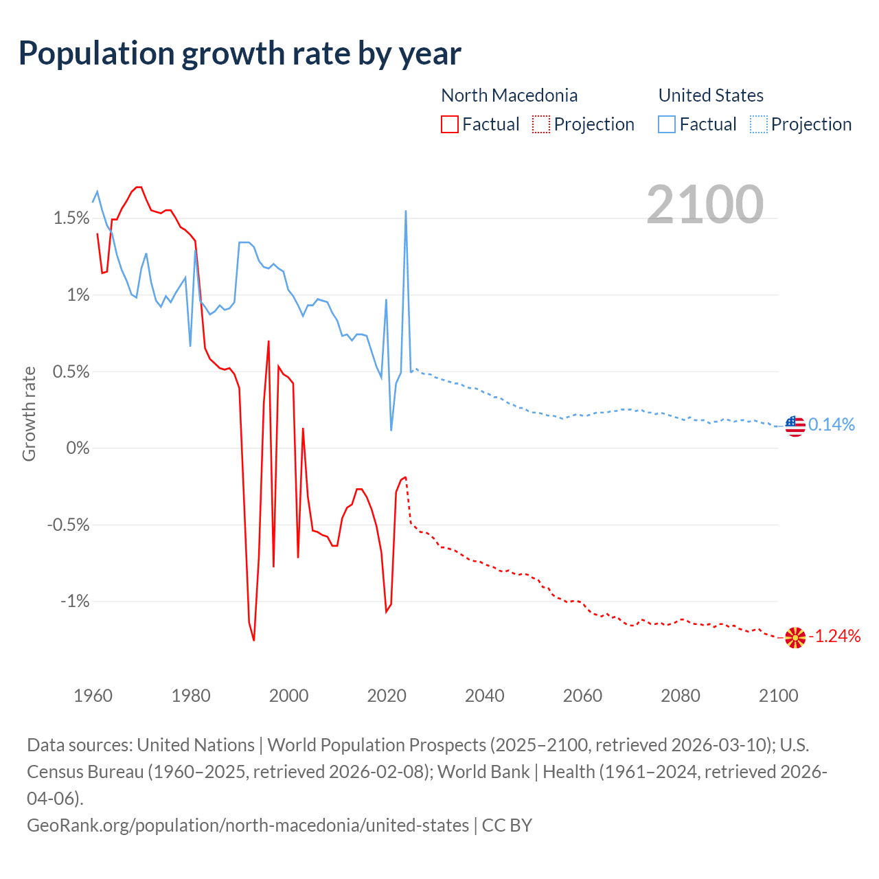 Data sources: World Bank | Health (1960–2024, retrieved 2026-04-06); United Nations | World Population Prospects (1960–2026, retrieved 2026-03-10); U.S. Census Bureau (1960–2025, retrieved 2026-02-08); Central Intelligence Agency (CIA) (2000–2019, retrieved 2026-02-20).