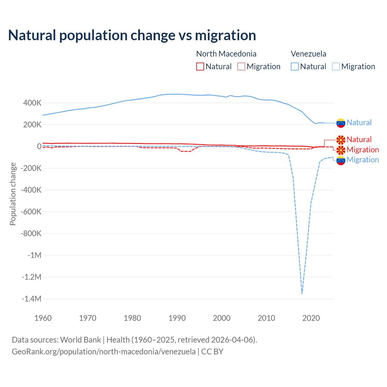 Over the last 10 years, 6.45% of the population change in North Macedonia is from natural causes (a loss of 12,585 people) and 93.5% is from migration (a loss of 182,429 people). In Venezuela 38.6% is from natural causes (a gain of 2,946,257 people) and 61.4% is from migration (a loss of 4,683,227 people).