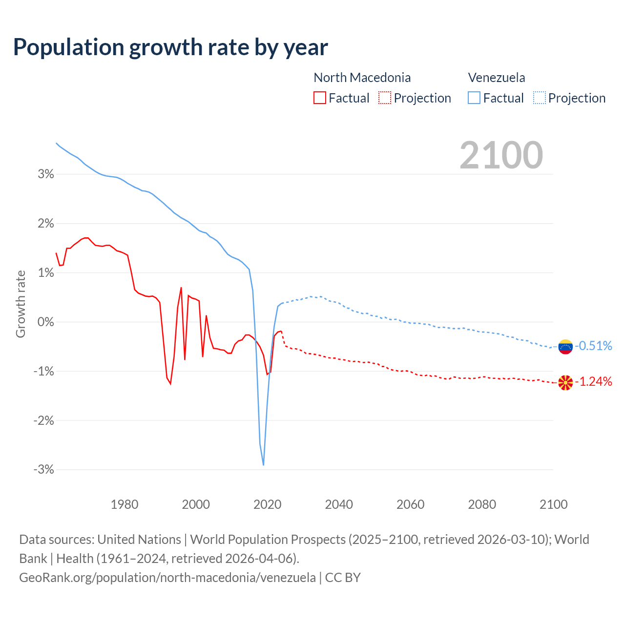 - For the last 10 years, North Macedonia has had an average growth rate of -0.48% per year vs -0.46% in Venezuela.