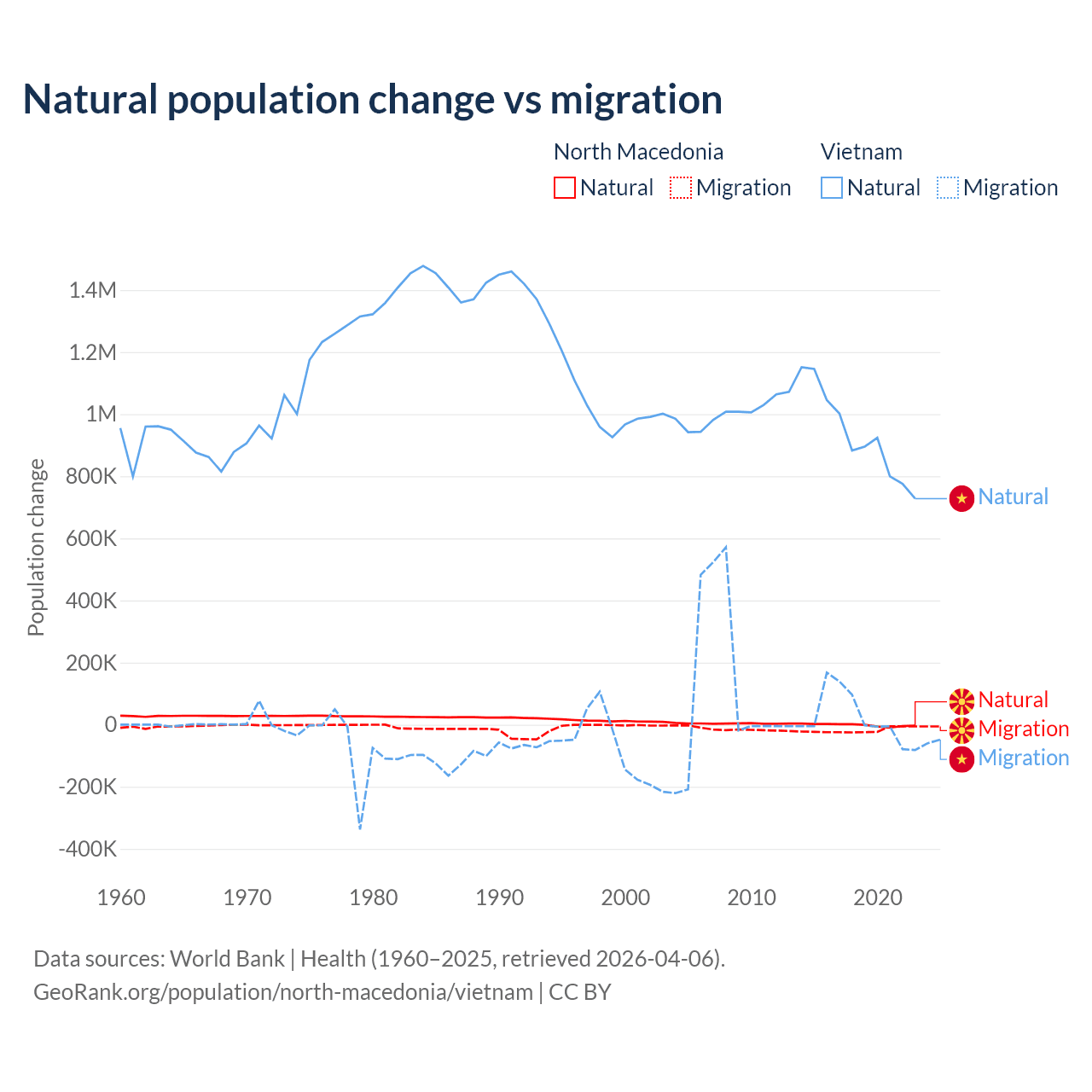 Over the last 10 years, 6.45% of the population change in North Macedonia is from natural causes (a loss of 12,585 people) and 93.5% is from migration (a loss of 182,429 people). In Vietnam 97.7% is from natural causes (a gain of 9,349,756 people) and 2.29% is from migration (a gain of 219,073 people).