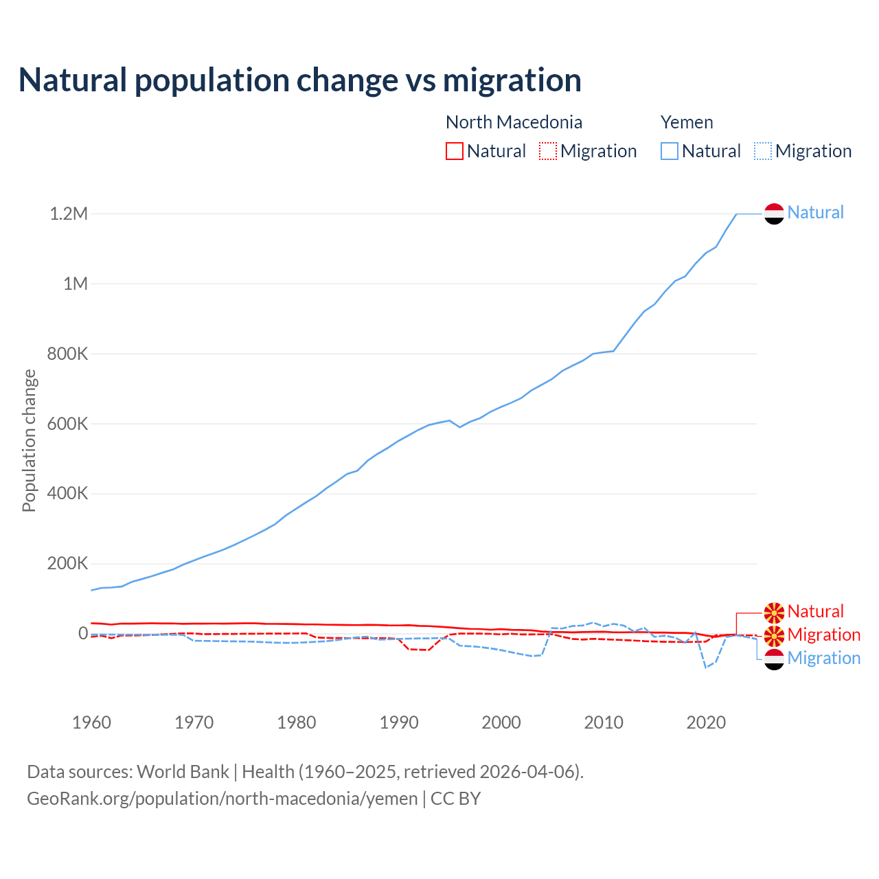 Over the last 10 years, 6.45% of the population change in North Macedonia is from natural causes (a loss of 12,585 people) and 93.5% is from migration (a loss of 182,429 people). In Yemen 97.8% is from natural causes (a gain of 10,460,813 people) and 2.17% is from migration (a loss of 231,814 people).