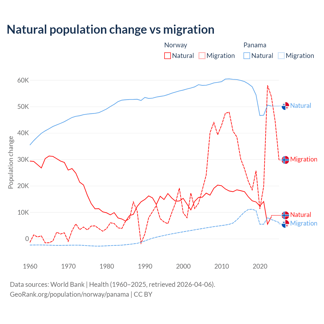 Over the last 10 years, 31.3% of the population change in Norway is from natural causes (a gain of 138,699 people) and 68.7% is from migration (a gain of 303,945 people). In Panama 86.5% is from natural causes (a gain of 544,211 people) and 13.5% is from migration (a gain of 84,849 people).