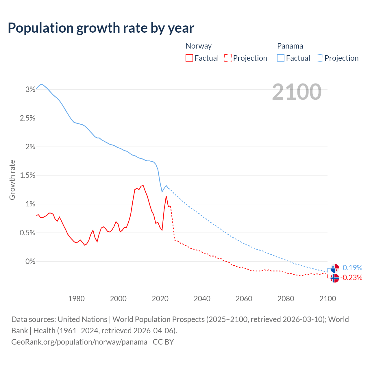- For the last 10 years, Norway has had an average growth rate of +0.85% per year vs +1.52% in Panama.