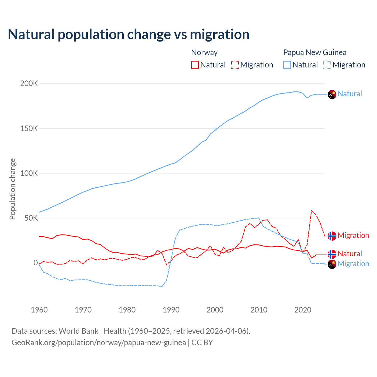 Over the last 10 years, 31.3% of the population change in Norway is from natural causes (a gain of 138,699 people) and 68.7% is from migration (a gain of 303,945 people). In Papua New Guinea 91% is from natural causes (a gain of 1,883,906 people) and 8.98% is from migration (a gain of 185,900 people).