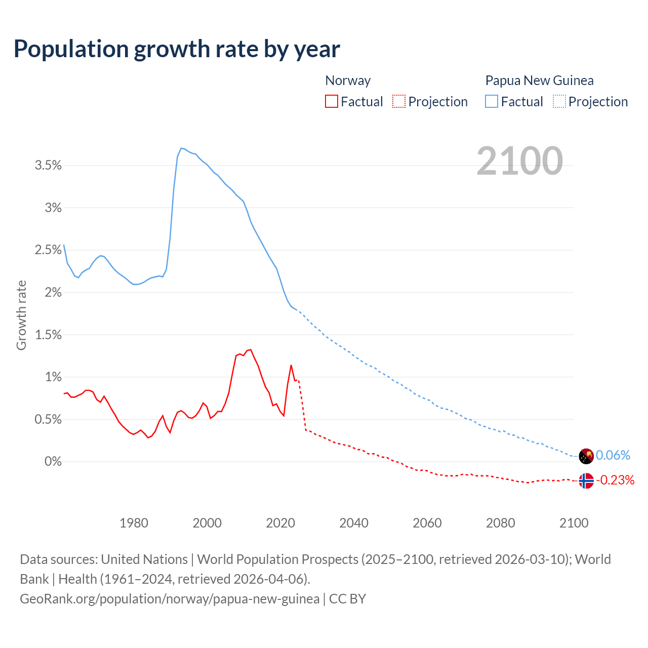 - For the last 10 years, Norway has had an average growth rate of +0.85% per year vs +2.23% in Papua New Guinea.