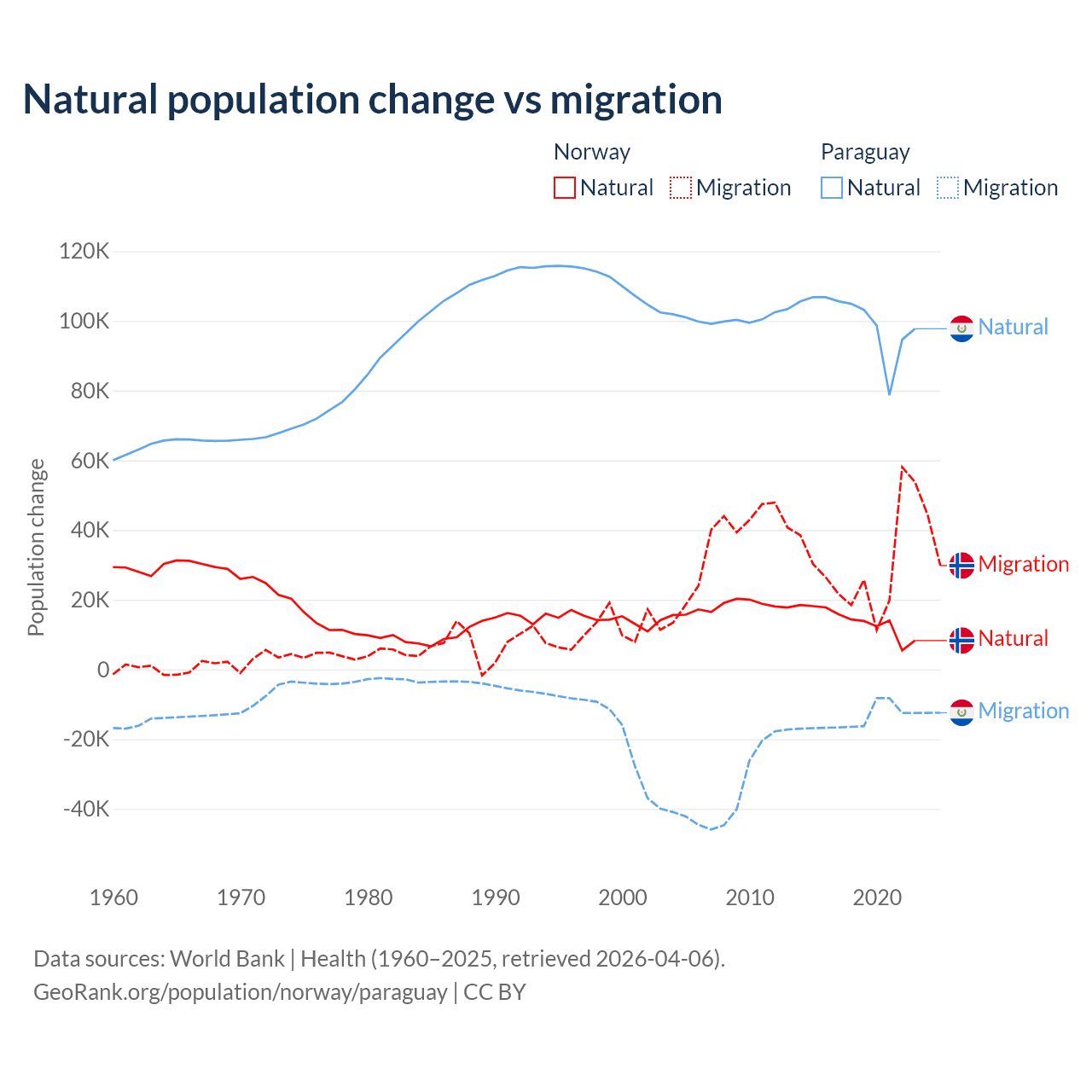 Over the last 10 years, 31.3% of the population change in Norway is from natural causes (a gain of 138,699 people) and 68.7% is from migration (a gain of 303,945 people). In Paraguay 87.6% is from natural causes (a gain of 1,002,636 people) and 12.4% is from migration (a loss of 141,377 people).