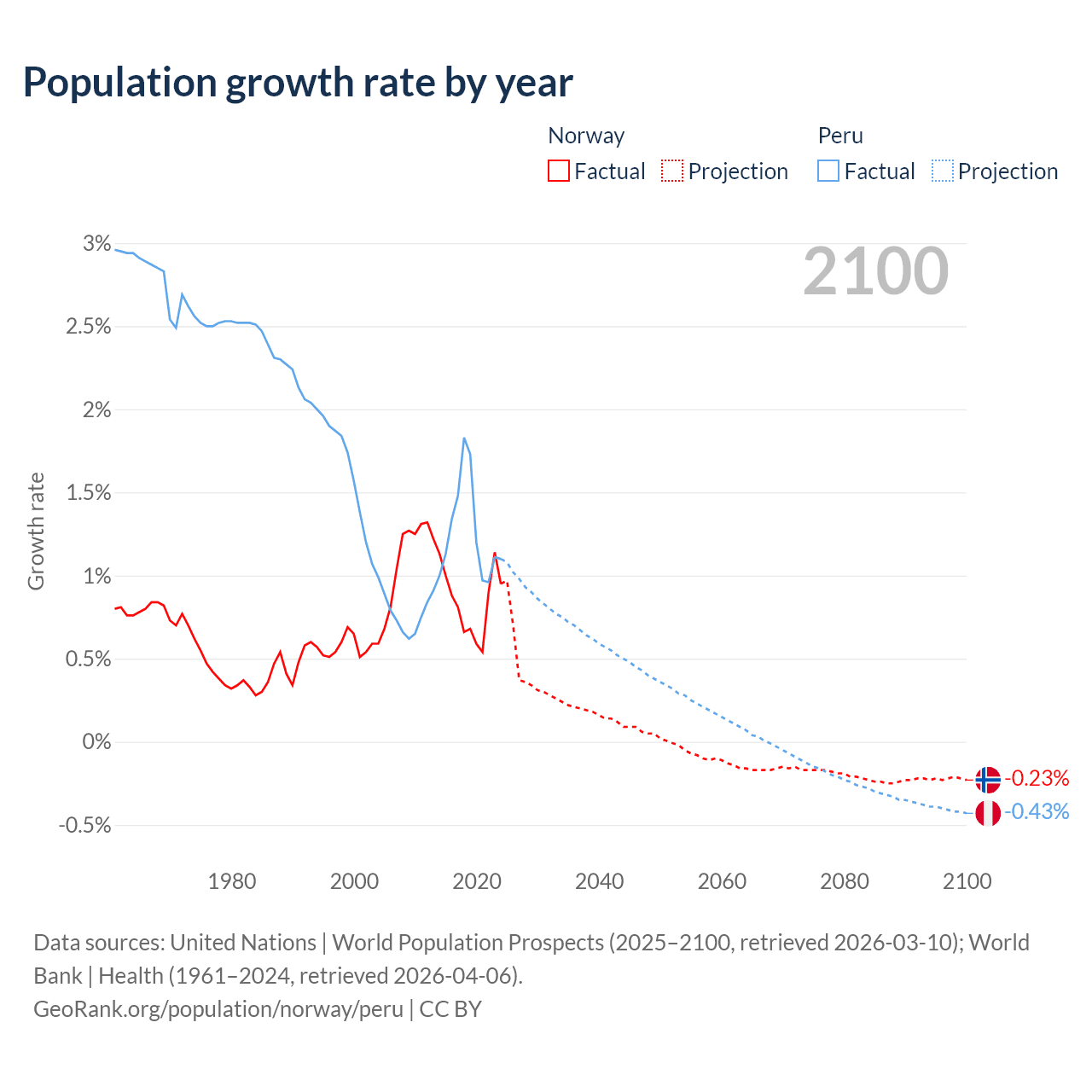 - For the last 10 years, Norway has had an average growth rate of +0.85% per year vs +1.26% in Peru.