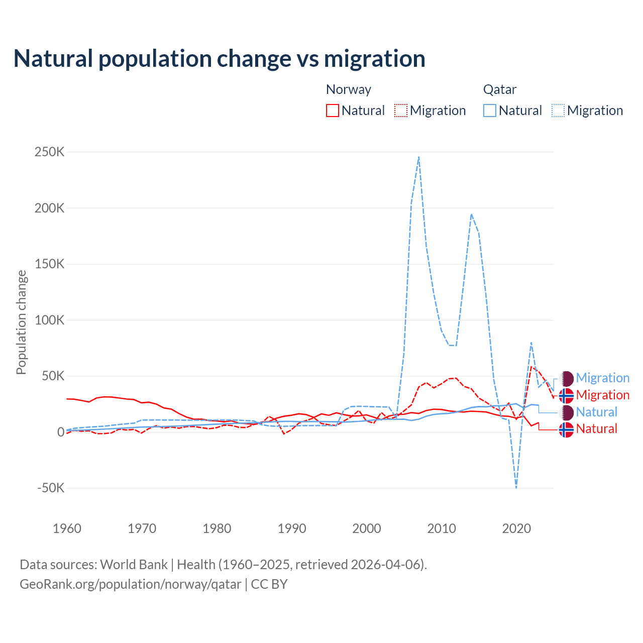 Over the last 10 years, 31.3% of the population change in Norway is from natural causes (a gain of 138,699 people) and 68.7% is from migration (a gain of 303,945 people). In Qatar 26.1% is from natural causes (a gain of 232,009 people) and 73.9% is from migration (a gain of 655,712 people).