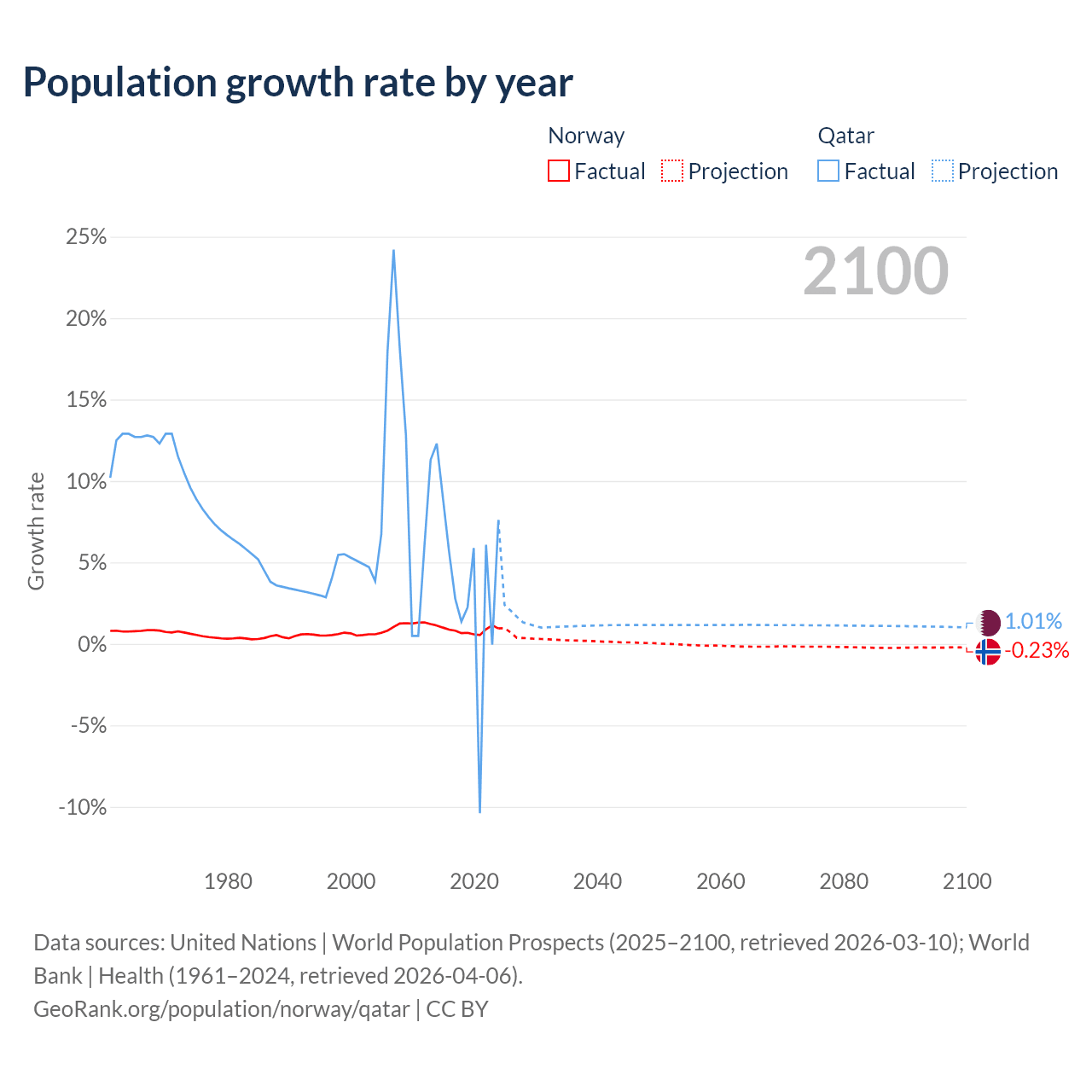 - For the last 10 years, Norway has had an average growth rate of +0.85% per year vs +3.86% in Qatar.