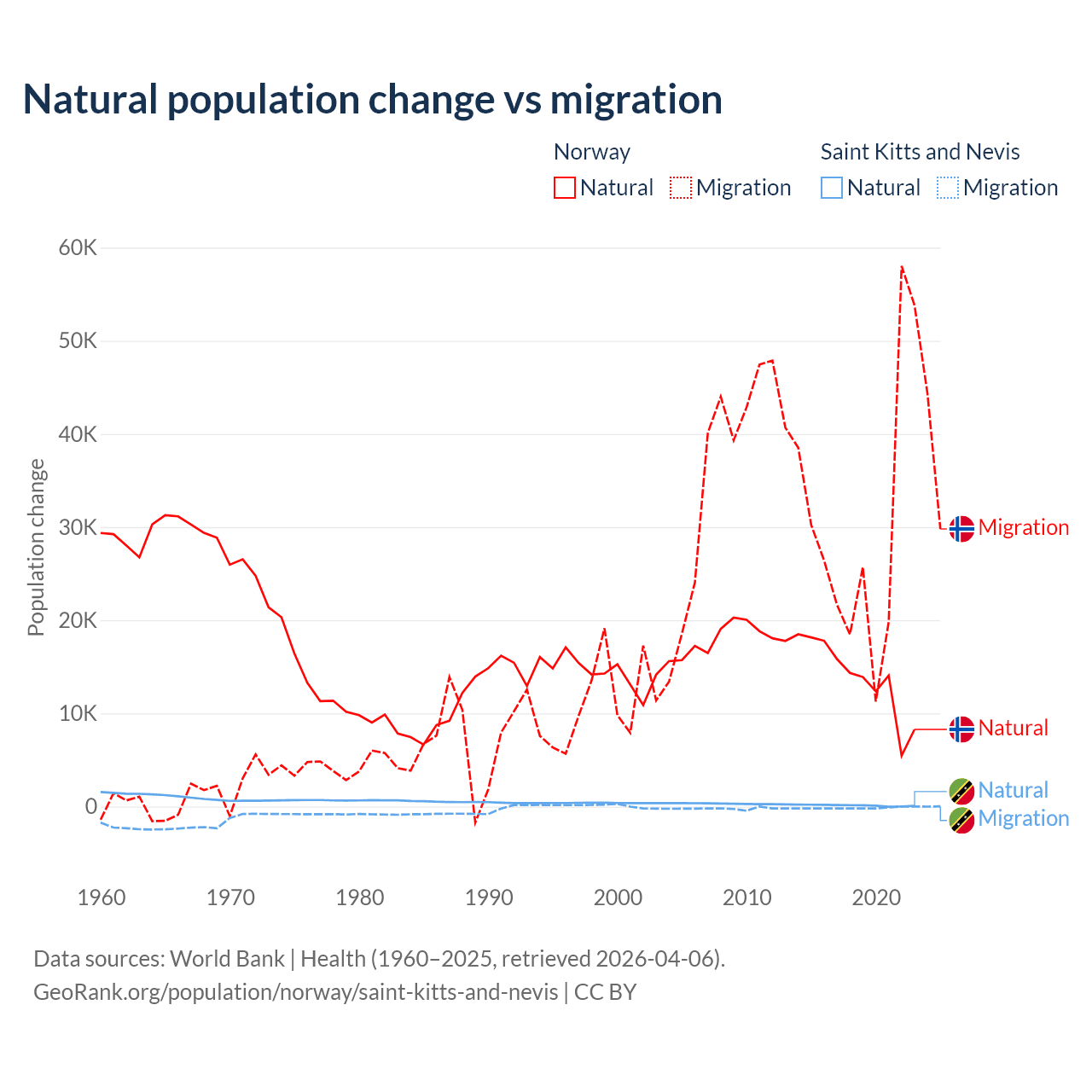 Over the last 10 years, 31.3% of the population change in Norway is from natural causes (a gain of 138,699 people) and 68.7% is from migration (a gain of 303,945 people). In Saint Kitts and Nevis 44.9% is from natural causes (a gain of 1,225 people) and 55.1% is from migration (a loss of 1,506 people).