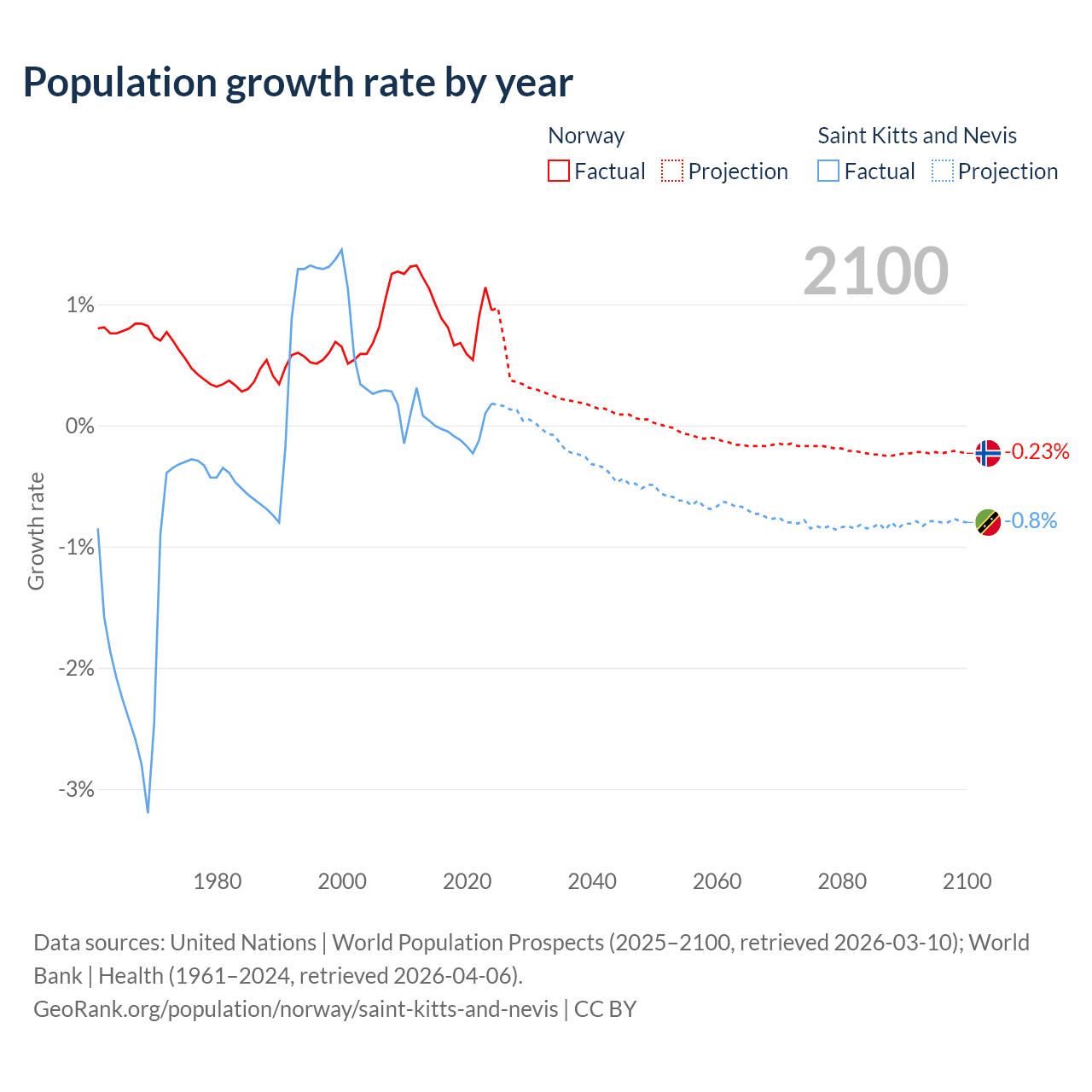 - For the last 10 years, Norway has had an average growth rate of +0.85% per year vs -0.04% in Saint Kitts and Nevis.