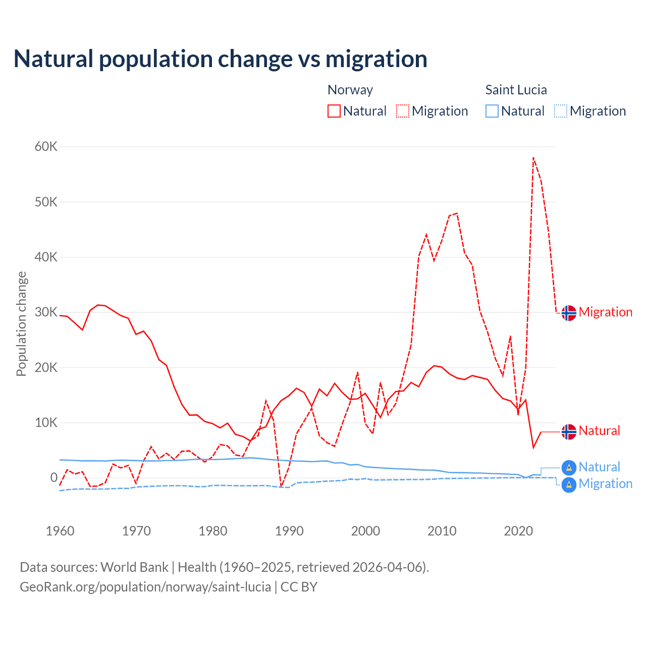 Over the last 10 years, 31.3% of the population change in Norway is from natural causes (a gain of 138,699 people) and 68.7% is from migration (a gain of 303,945 people). In Saint Lucia 95.7% is from natural causes (a gain of 6,039 people) and 4.31% is from migration (a loss of 272 people).