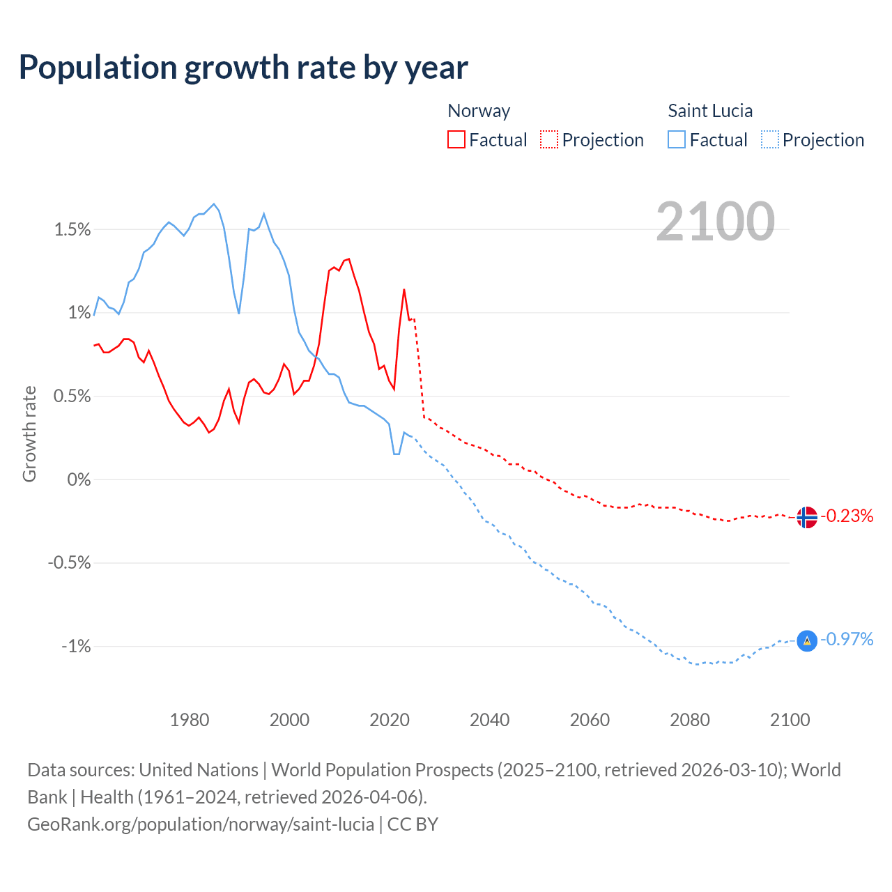 - For the last 10 years, Norway has had an average growth rate of +0.85% per year vs +0.33% in Saint Lucia.
