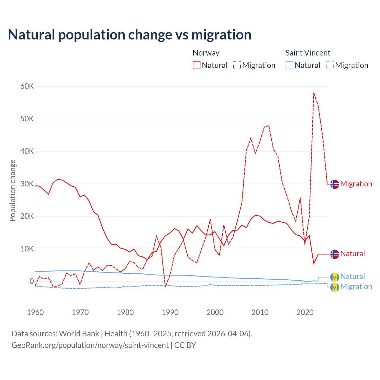 Over the last 10 years, 31.3% of the population change in Norway is from natural causes (a gain of 138,699 people) and 68.7% is from migration (a gain of 303,945 people). In Saint Vincent 21.2% is from natural causes (a gain of 2,525 people) and 78.8% is from migration (a loss of 9,393 people).